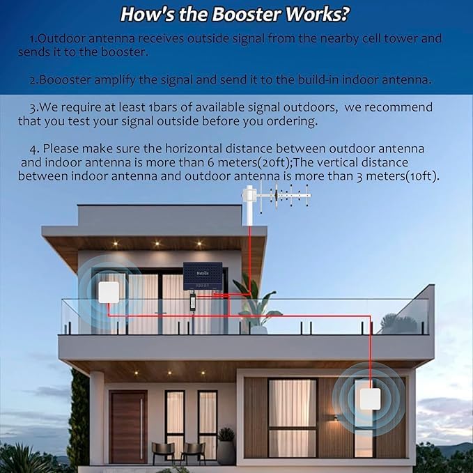 Eay Installation Keep the power is off during installing/adjusting antennas. Simply set up the outdoor Log-periodic antenna, and place signal booster where you want. Make sure the distance between the outdoor antenna and indoor antenna should be about 32ft. Following the user manual, you can easily set it up.