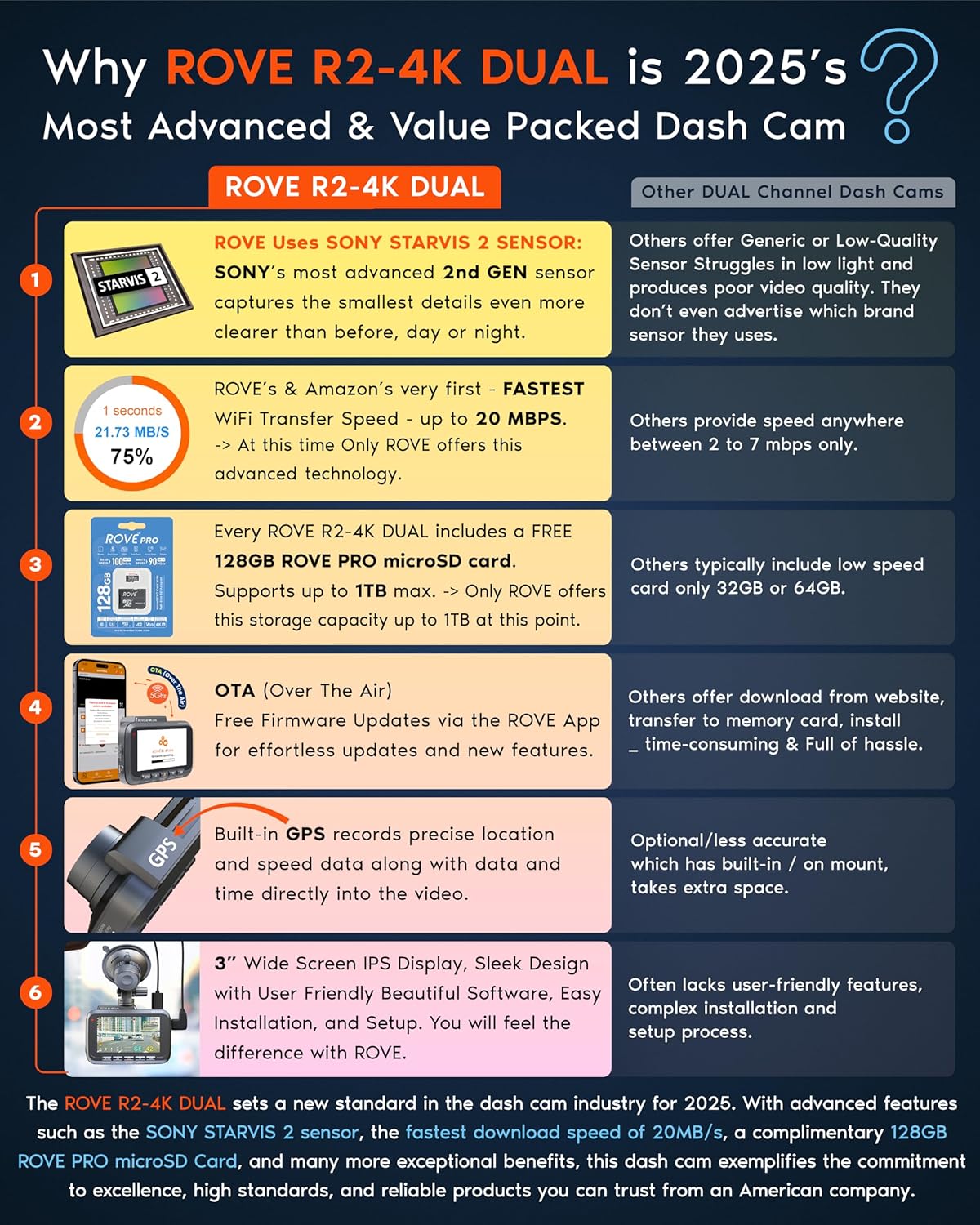 ROVE R2-4K DUAL Dash Cam Front and Rear, STARVIS 2 Sensor, FREE 128GB Card Included, 5G WiFi – up to 20MB/s Fastest Download Speed with App, 4K 2160P/FHD Dash Camera for Cars, 3″ IPS, 24H Parking Mode