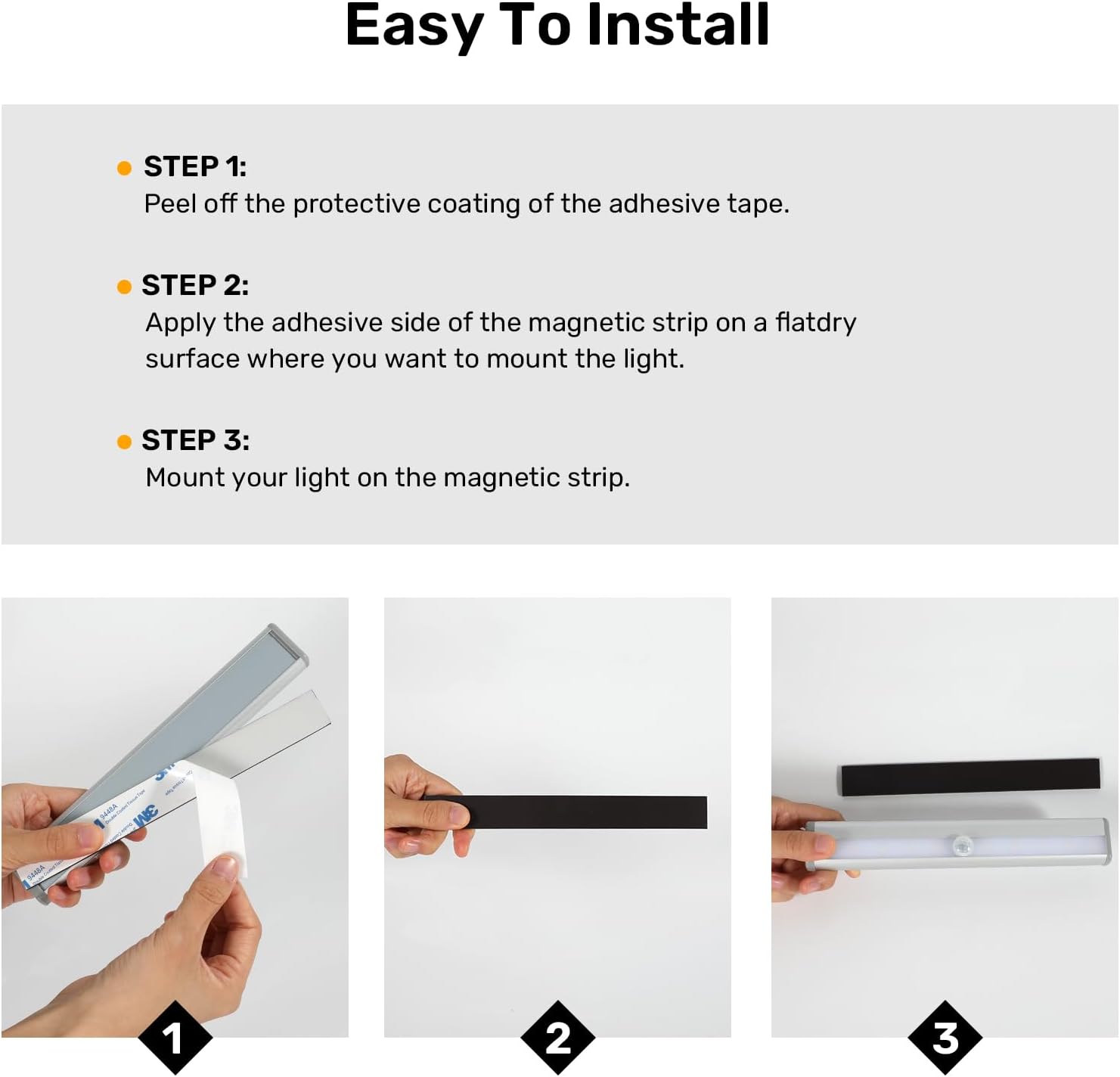 【Easy To Install】No tools, screws, or nuts are required to install these automatic light For RV step. Just peel off the tape and attach the magnetic strip to the location you want to install, the magnetic motion sensor light will automatically attach to the strip, allowing for easy battery removal and replacement. For best adhesion results, please mount the magnetic strip on a clean, dry, smooth flat surface.