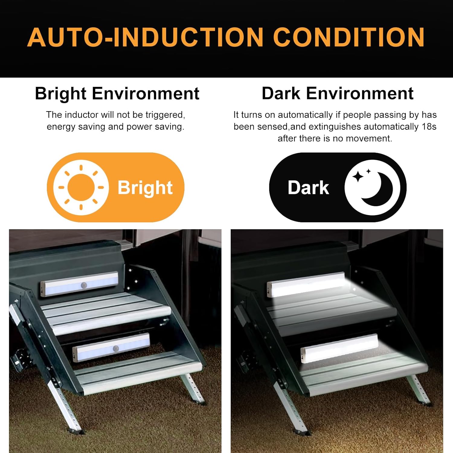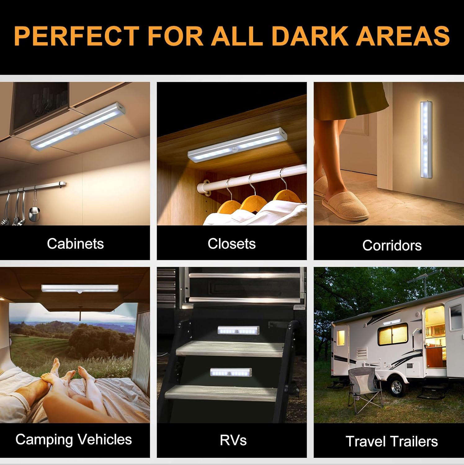 Versatile: Includes 2 RV motion sensor lights and 2 USB cables, it is a great choice for lighting dark areas. Durable and sturdy material that will not be easily damaged when used indoors or outdoors. Portable design, providing brightness to various places without wired power supply. Suitable for fit for indoor dark places such as cabinets, closets, corridors, and bathrooms, as well as outdoor dark places such as camping vehicles, RVs, and travel trailers.