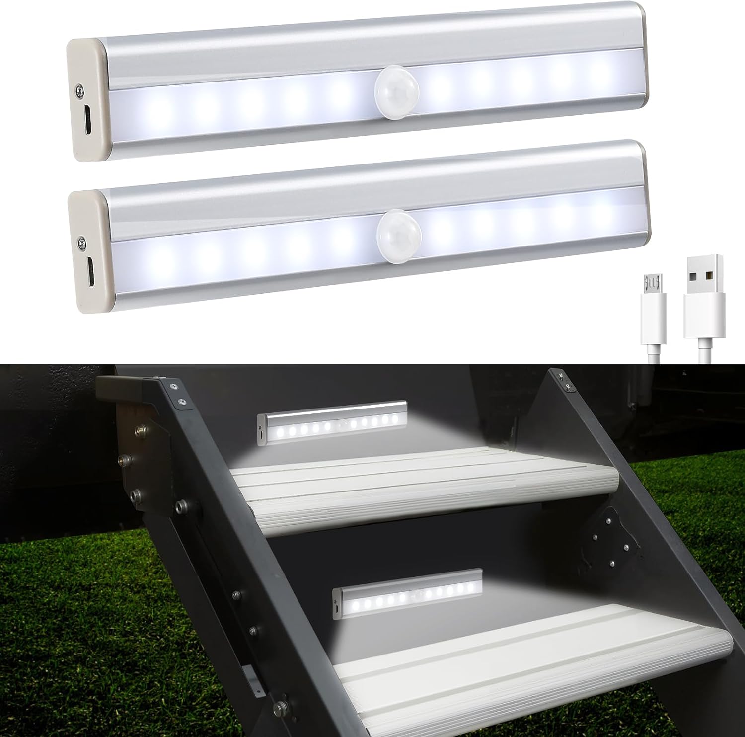Nuovoware 2 Pack Motion Sensor RV Step Lights, 10 LED USB Rechargeable Motorhome Motion Activated Light Strip, Magnetic Night Light Bar for Motorhome Travel, Travel Trailers, Camper