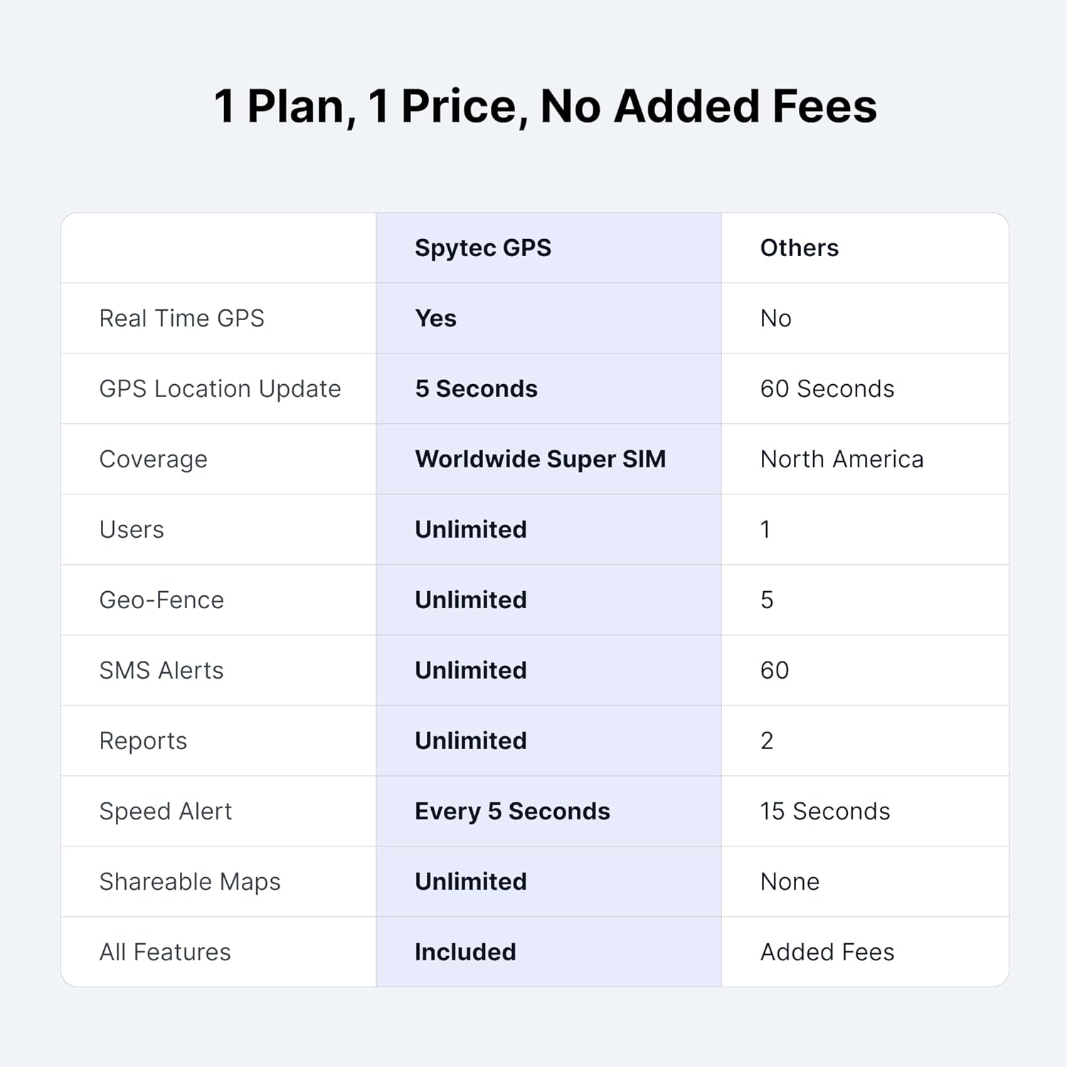 Our industry-leading 5 second updates are standard with our trackers. Other companies will advertise a lower price, but they charge you extra for pinging more than every 60 seconds.