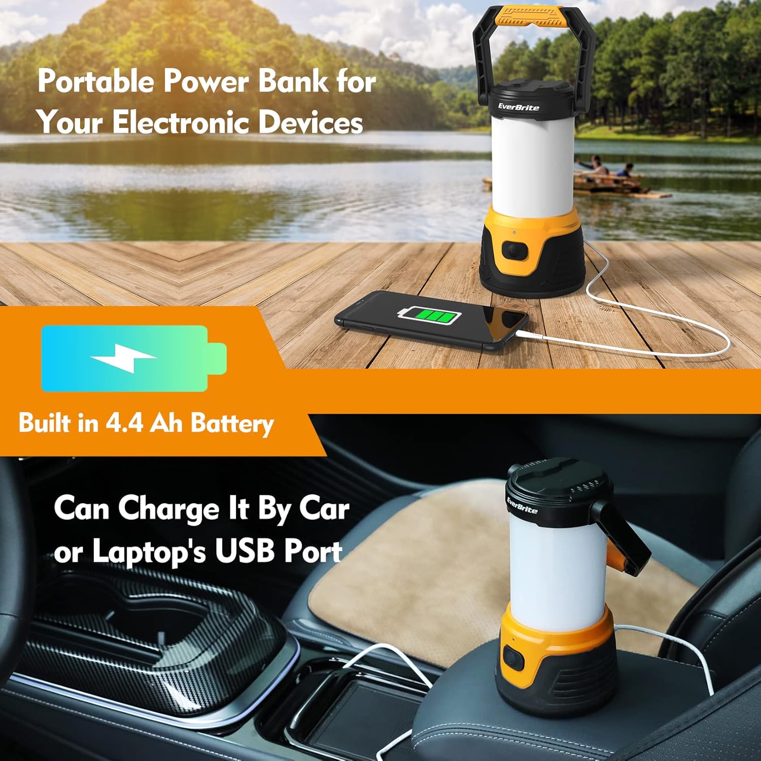 Rechargeable& Power Bank: The lantern comes with a USB and Type-c data cable; when you are outdoors, you can charge it by car or laptop’s USB Port; Built-in 4.4 Ah Battery, 8 hours run time in low mode; You can also use it as a portable power bank for your phone or others electronic devices, that is so convenient for you outdoors or in other emergencies