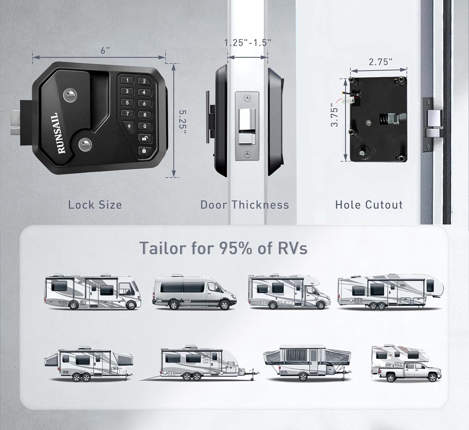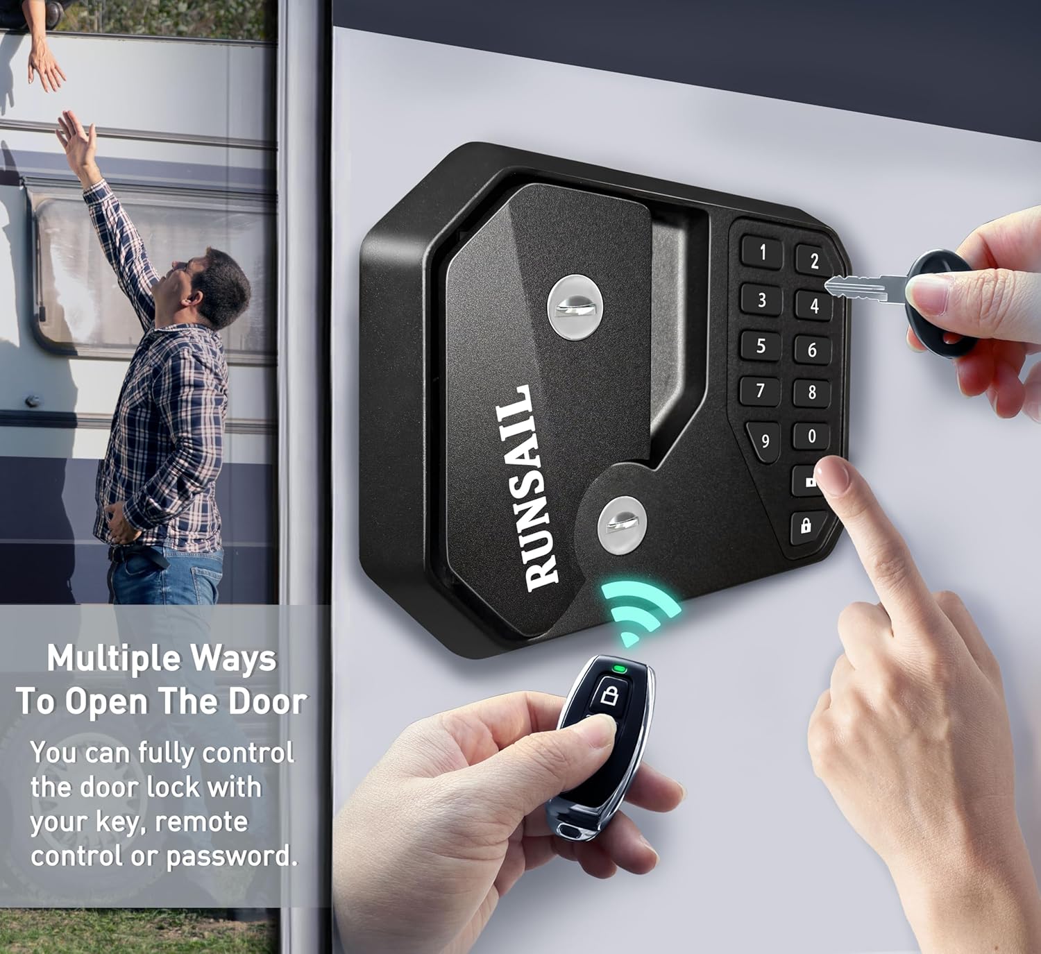 THREE WAYS to UNLOCK:This RV keyless entry door lock has three unlocking methods, including FOB remote access, keypad entry and Mechanical keys.Even in emergencies, you can enter the RV without worry.