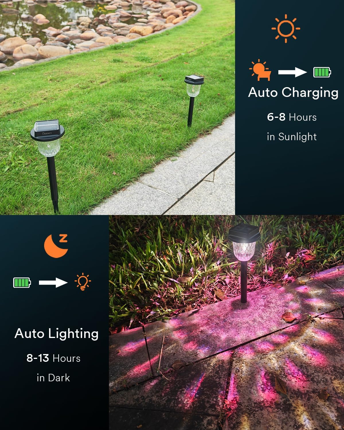 Green Energy & Longer Lighting: Solar lights outdoor waterproof use high-quality ABS material, build-in 500mAh capacity battery which means solar outdoor lights can collect and store more solar energy, continous lighting for 8-12hrs after charging for 6-8hours in sun. Solar path lights use green energy–solar power, which save your electricity bill and protect our environment. Select us, make your right choice