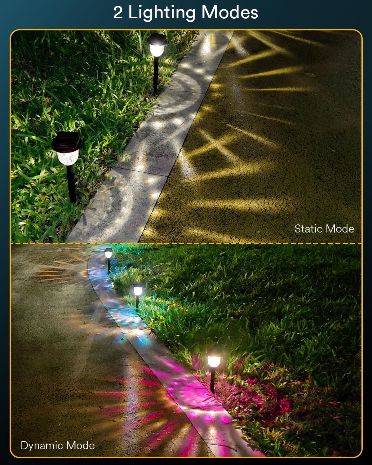 2 Lighting Modes & High-Brightness: Outdoor lawn lights solar powered have 2 lighting modes dynamic RGB multicolor and warm-white, will auto absorbs sunlight during the day and auto light up at night, which use multiple lamp beads and high transmittance lampshade makes our lights more brighter than ordinary solar path lights, which can be more perfect to project colorful pattern,you can decorate and illuminate your garden, lawn, walkway, yard, making them more beautiful and colorful
