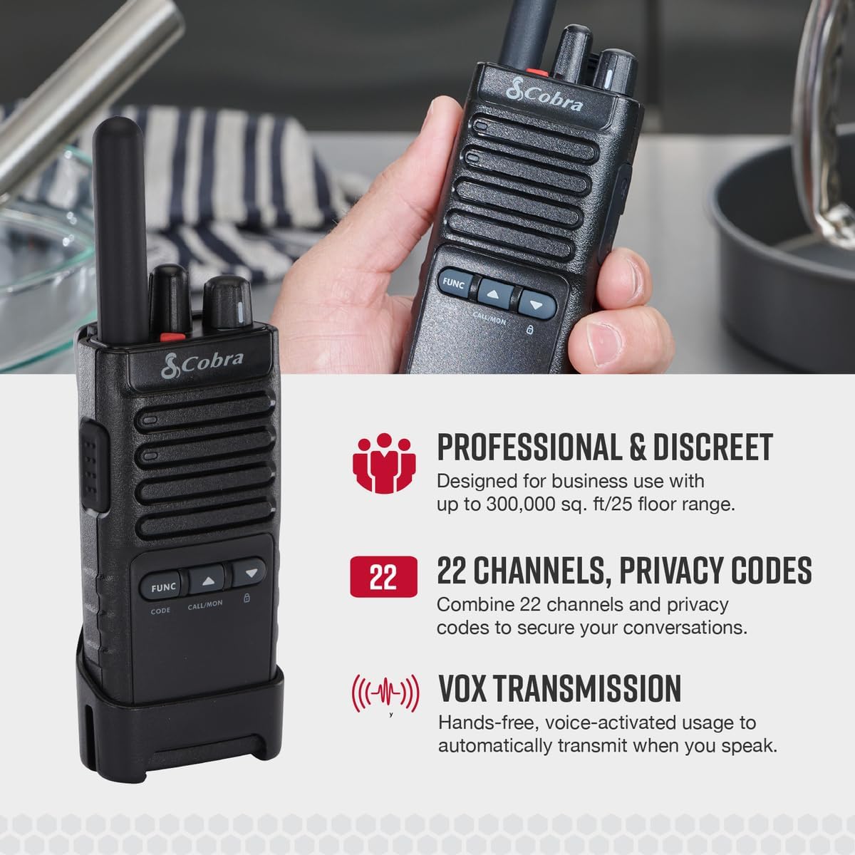 The Cobra PX650 Pro Business 2-Watt FRS Walkie Talkie Radios are ideal for larger business use and have a range up to 300,000 sq. ft./25 floors. Dust protected and splashproof from any direction. Cannot withstand water immersion. With the Push-To-Talk button, dedicated volume/channel knobs, and Waterproof (IPX4) Rating, you’ll always have clear and reliable communication.