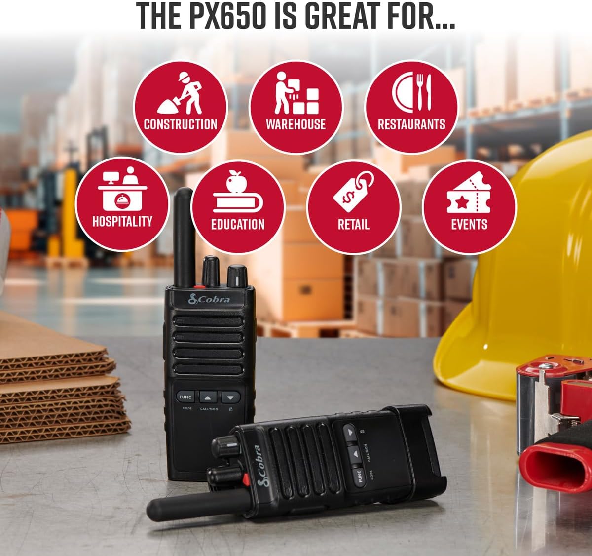 Cobra PX650 BCH6 – Professional/Business Walkie Talkies – Rechargeable, 300,000 sq. ft/25 Floor Range, Dust Protected and Splashproof (IP54 rating), Two-Way Radio Set (6-Pack)