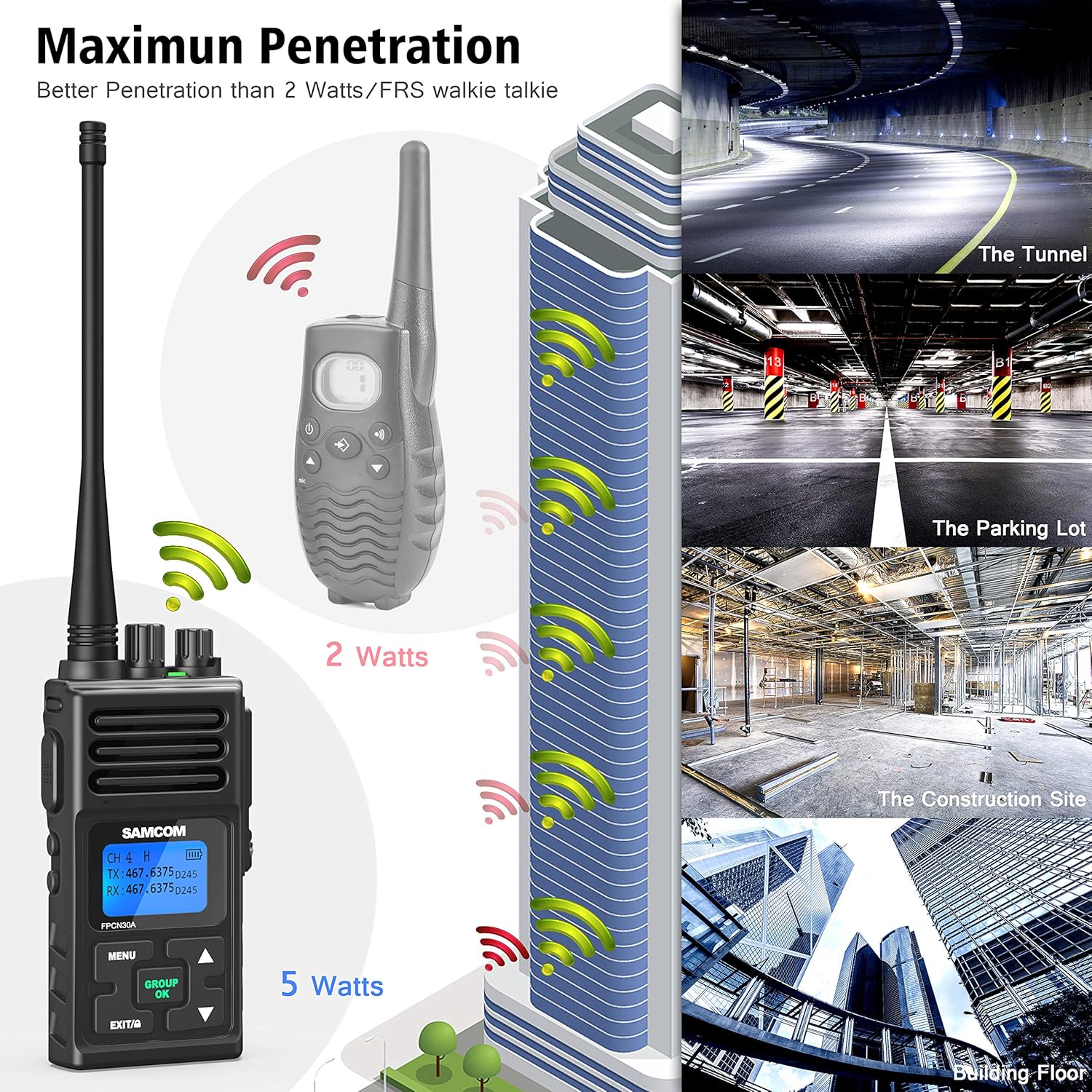 【TWO WAY RADIO LONG RANGE】20 channels with 5W strong penetration and long antenna ensure you can talk freely with your family and friends for hiking, hunting, climbing. Up to 30 miles in open areas &1-5 miles in build-up areas. High Power (5W) provides strong penetrating power between the construction area. Low Power (2W)Mode saves battery life and long use