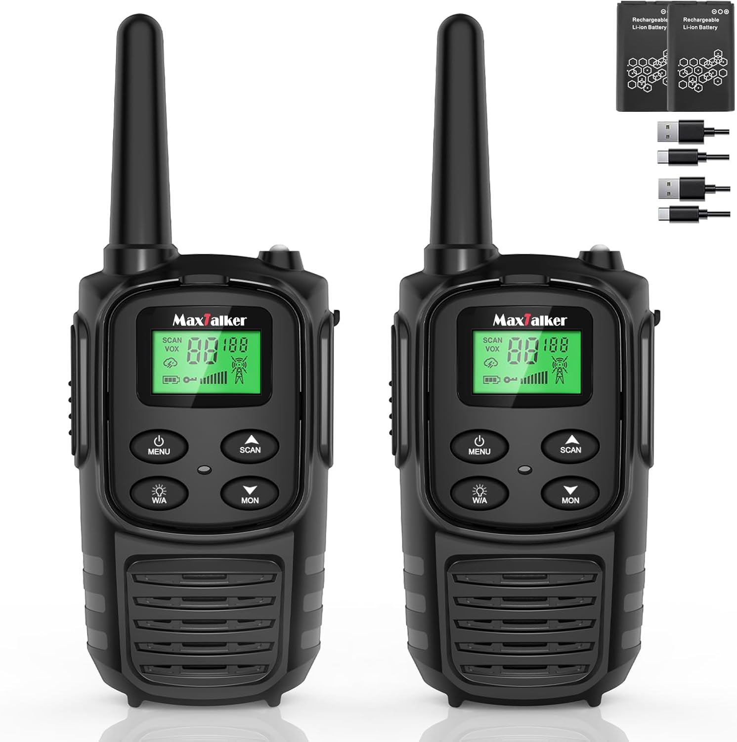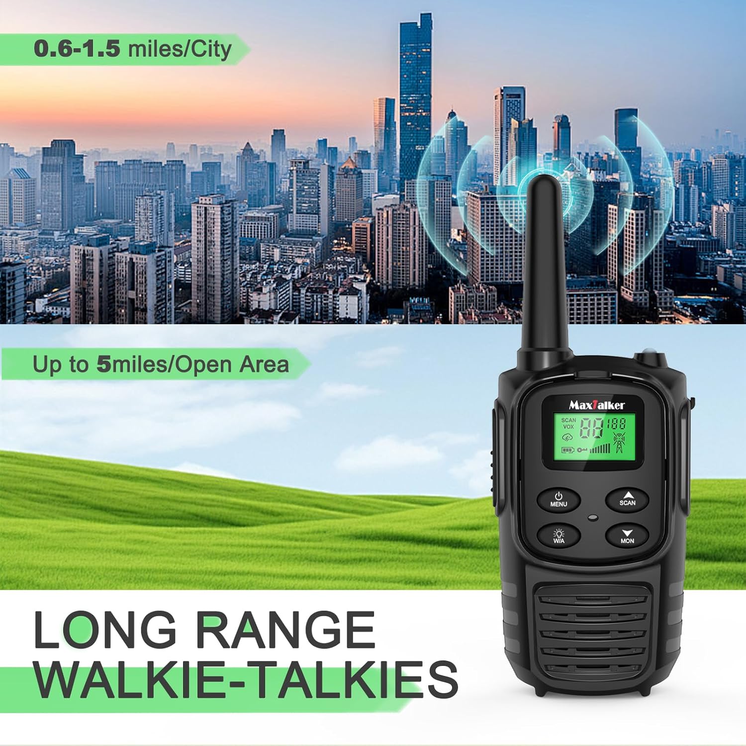 Walkie Talkies Long Range: MaxTalker MT10 FRS walkie talkies offer an impressive communication range of up to 5 miles in open areas, ensuring you can stay connected with friends and family during outdoor adventures, camping trips, or hiking excursions