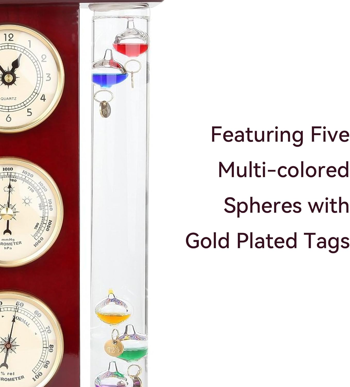 Lily’s Home Analog Weather Station, with Galileo Thermometer, a Precision Quartz Clock, and Analog Barometer and Hygrometer, 5 Multi-Colored Spheres (6″ L x 2″ W x 12″ H) – Gold