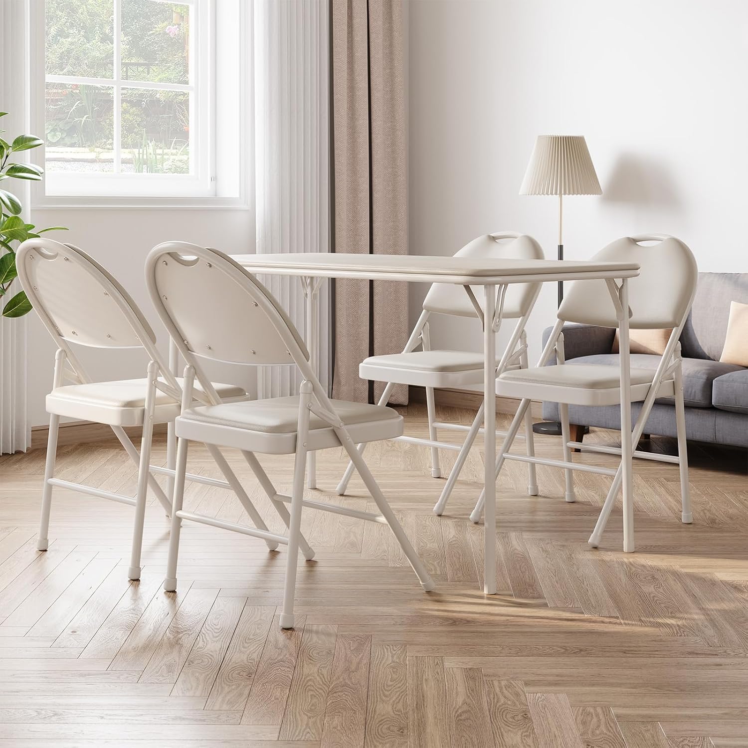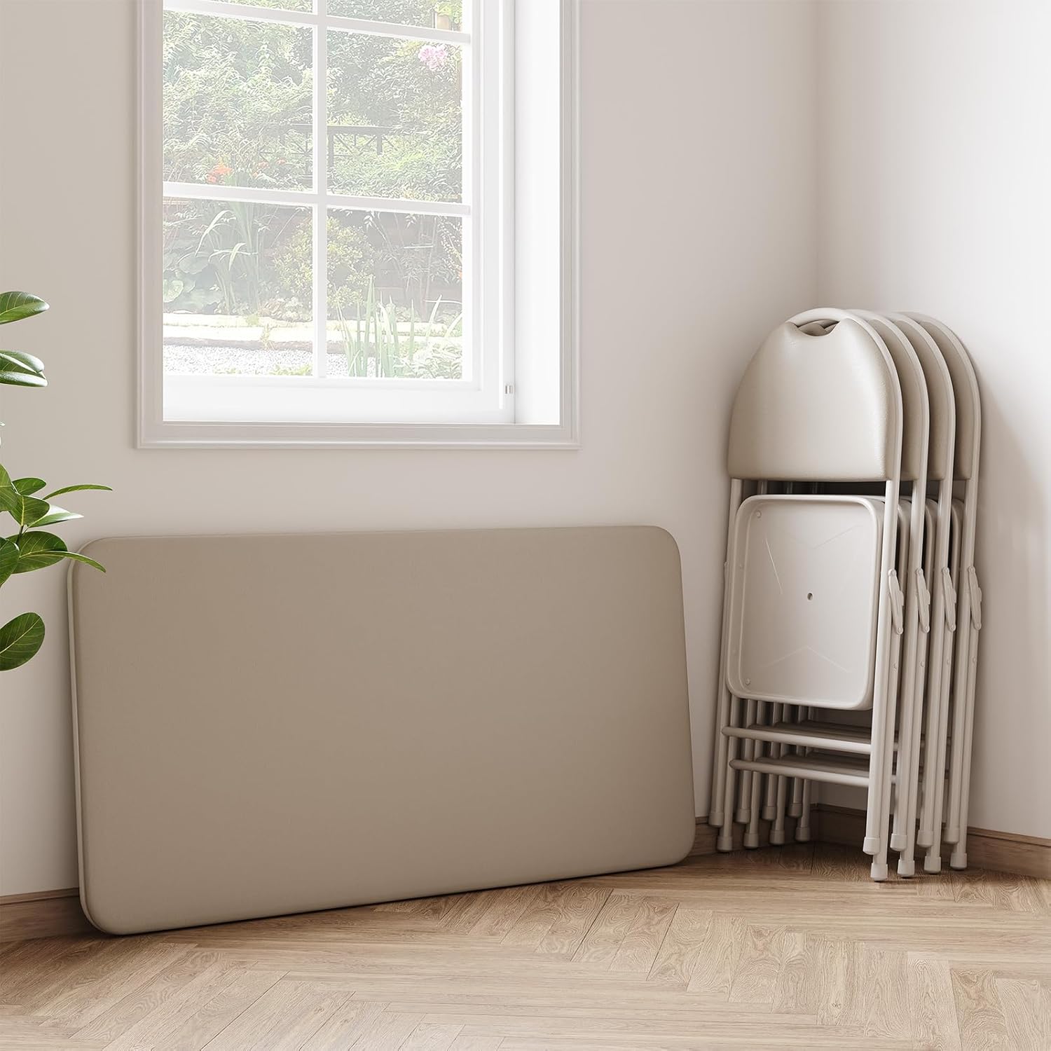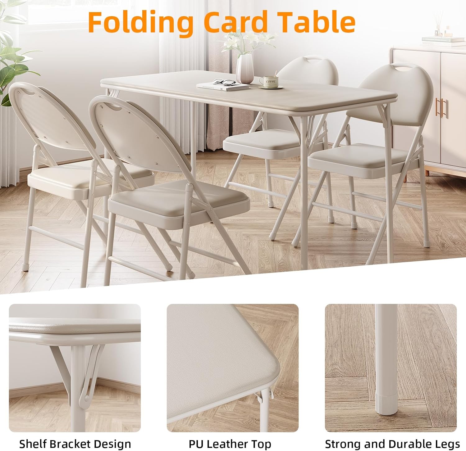 IDEALHOUSE Protable Folding Table and Chairs, 5 Piece Folding Card Table and Chairs Set, Foldable PU Upholstered Table and Chairs Set of 5, for Dining Room, Living Room, Office, Camping, Beige