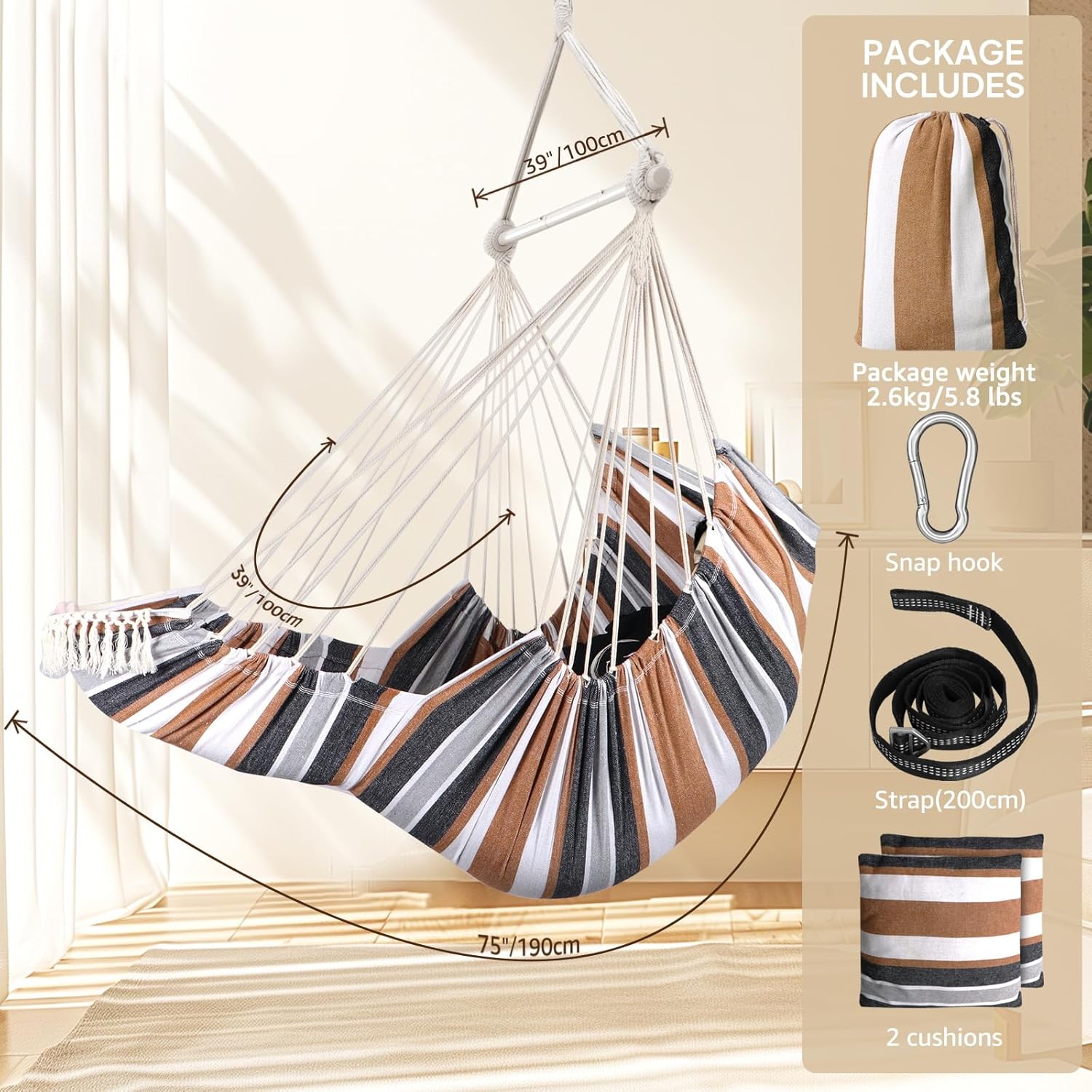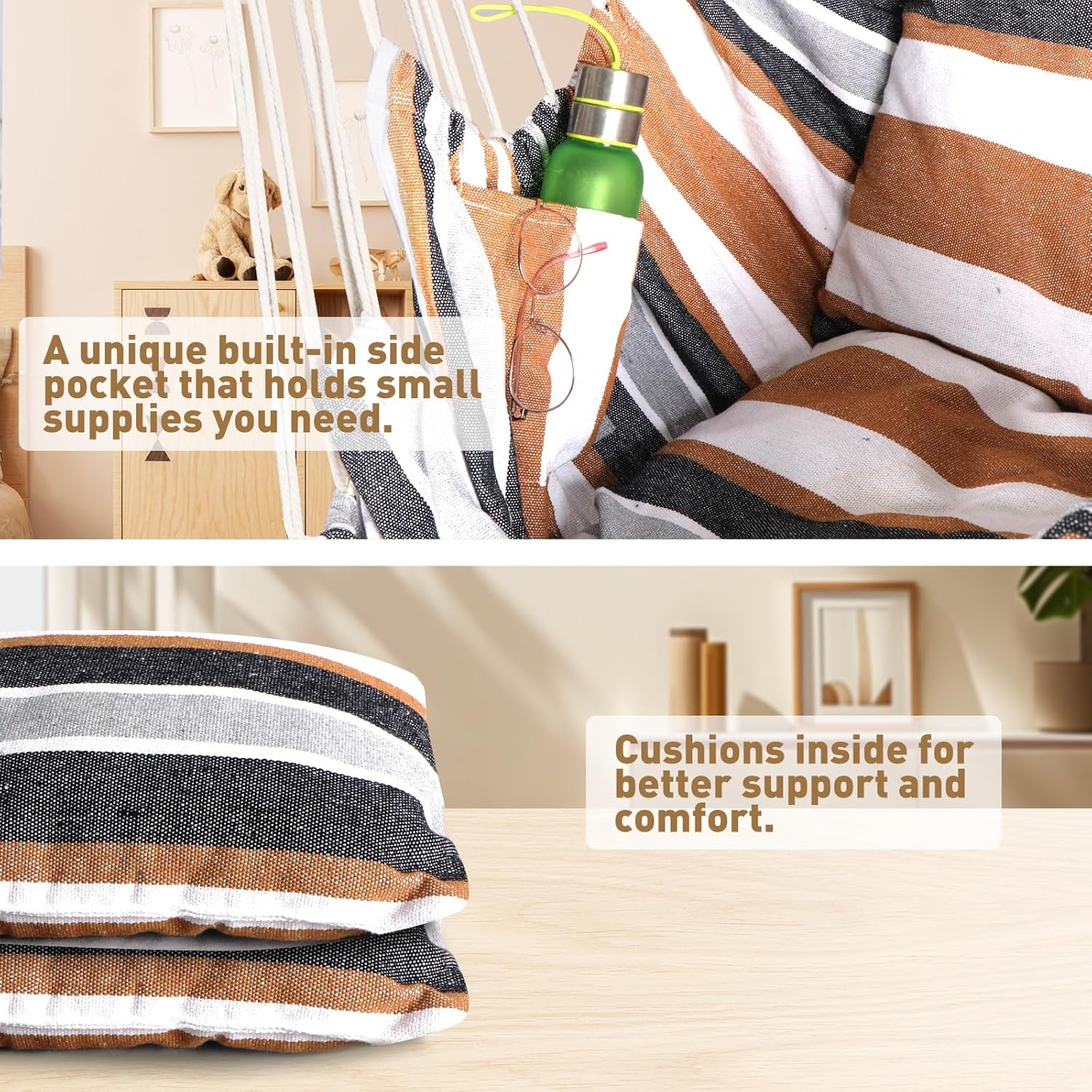 Comfort and Health benefits:They offer a gentle swaying motion that can be very soothing.Hammock chairs are incredibly comfortable and provide a unique sitting experience that can offer several health benefits, including improved circulation, reduced muscle tension, and better sleep quality.The feet support is foldable,so you can sit or recline.It comes with 2 cushions to ensure maximum comfort.