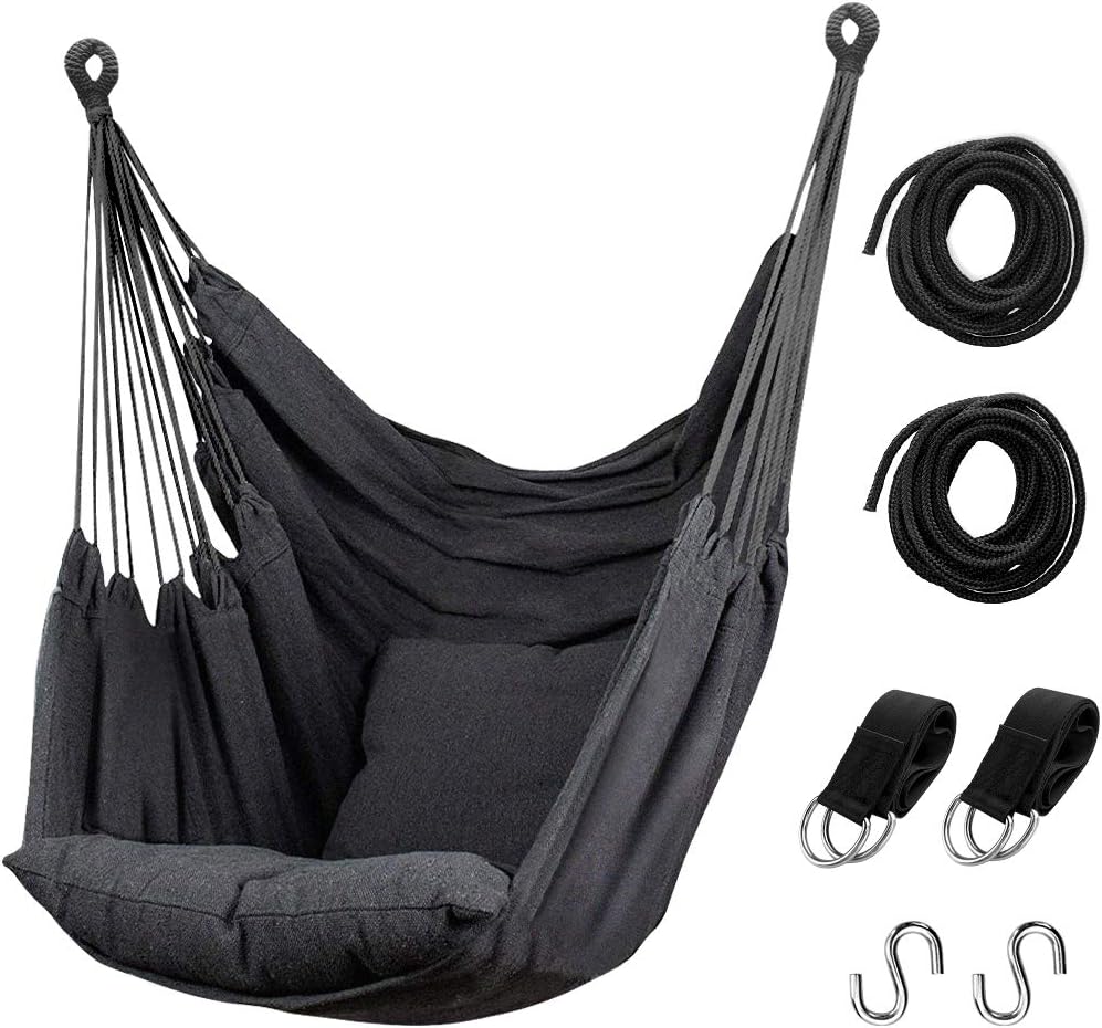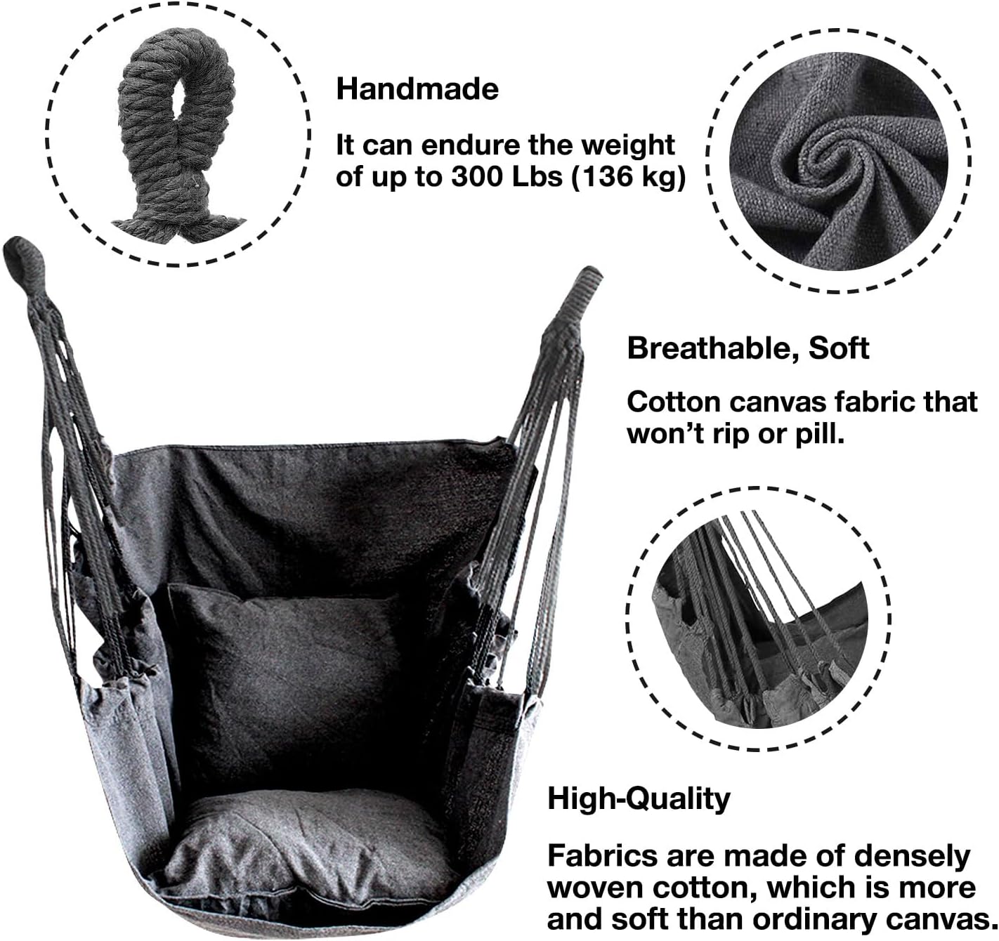 Hommtina Hammock Chair Hanging Rope Swing, Max 300 Lbs Hanging Chair with Pocket & Durability Perfect for Outdoor, Home, Bedroom, Patio, Yard (Pillows NOT Included,Dark Gray)