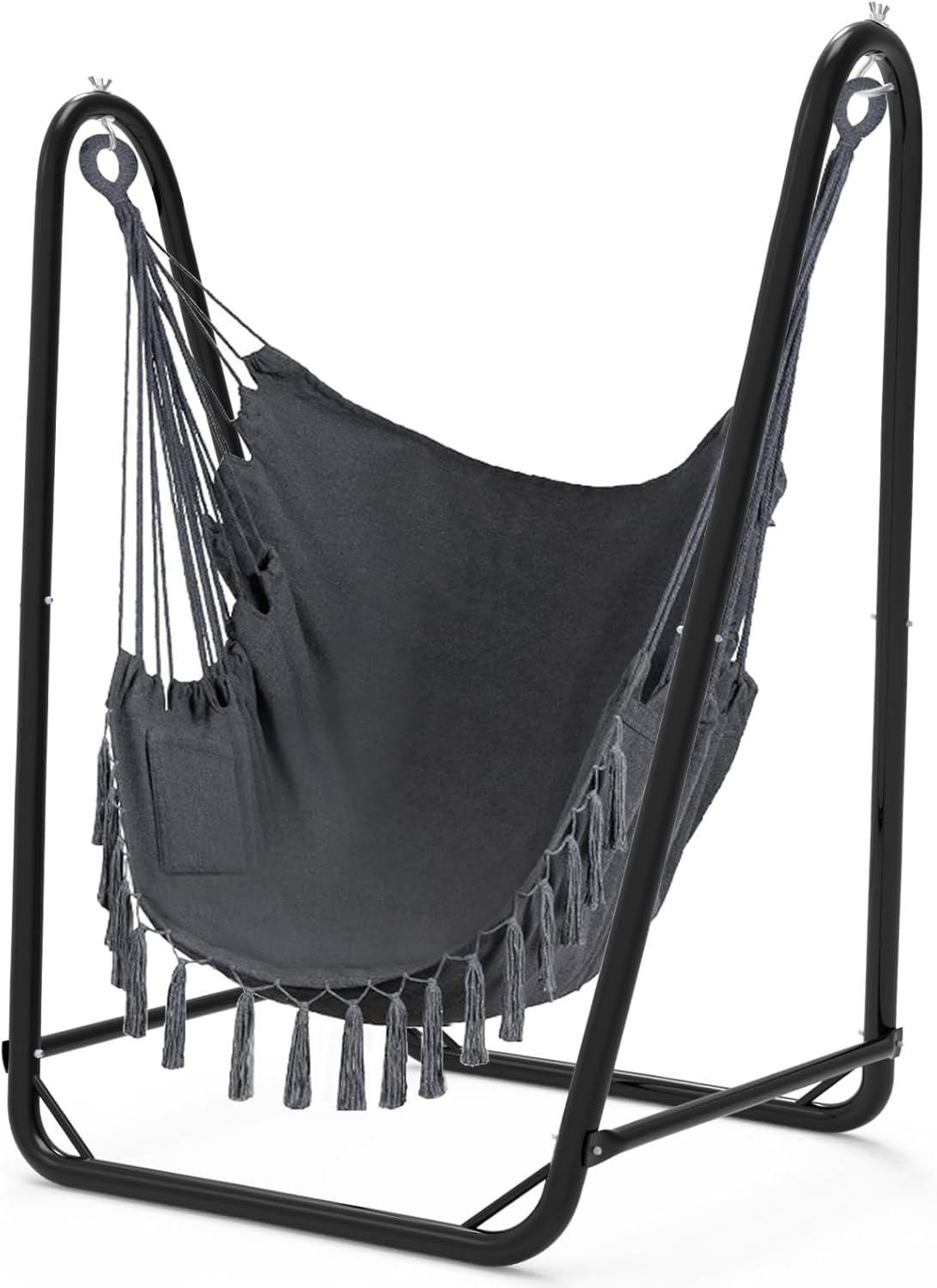 Unique U-Shaped Hammock Chair with Stand,Sturdy & Rust-Resistant,Free Gray Cotton Hammock Chair