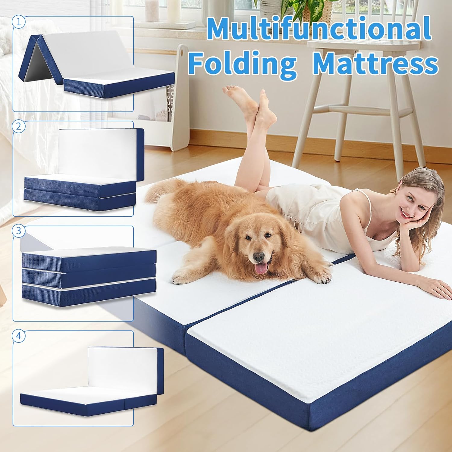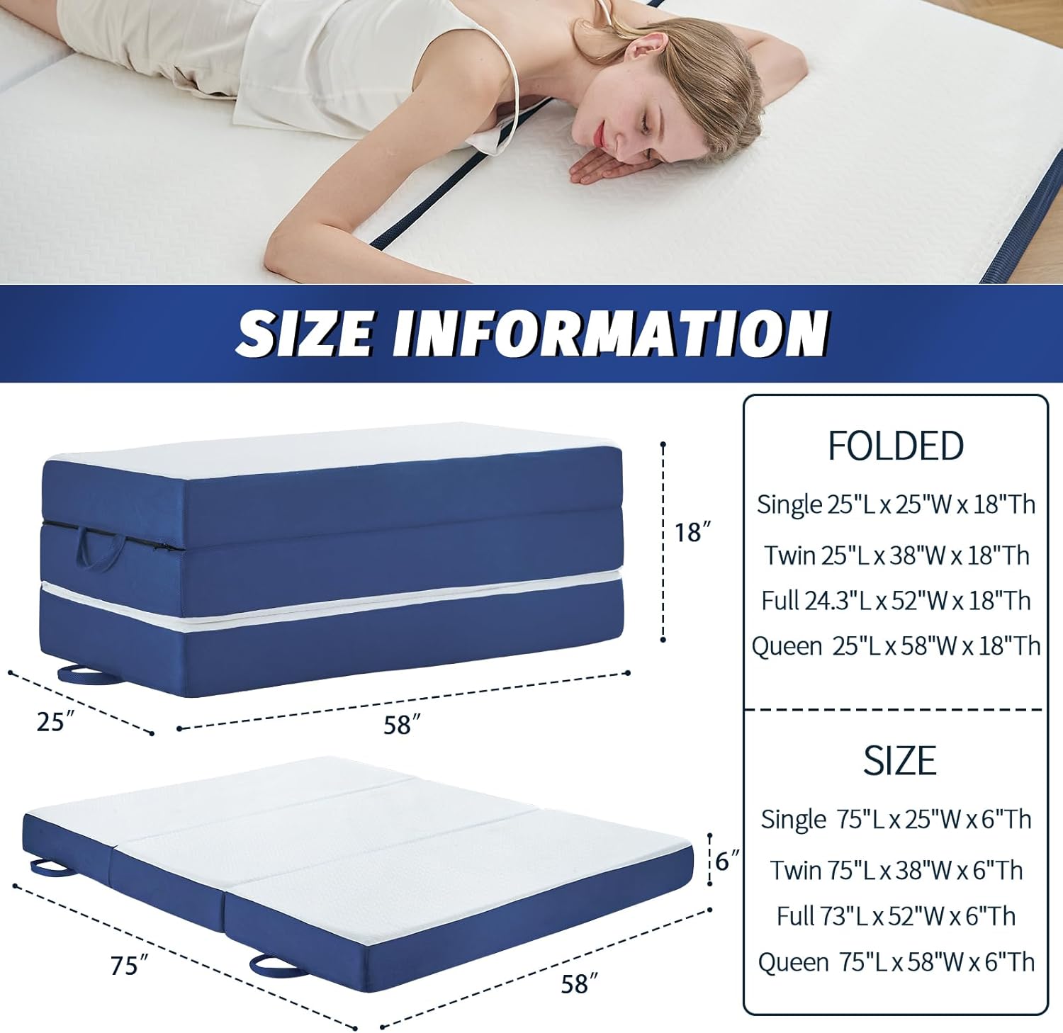 Provide a Good Sleeping Environment: Our tri-fold mattress is made of 6-inch 2.5cm 30D memory foam, which can easily cope with the changes in different body postures and make you sleep more comfortably. The 7.6cm 26D high-density sponge has strong support to ensure that the body is isolated from the ground, and the density of the supporting sponge is higher than that of ordinary floor mattresses, with higher stability