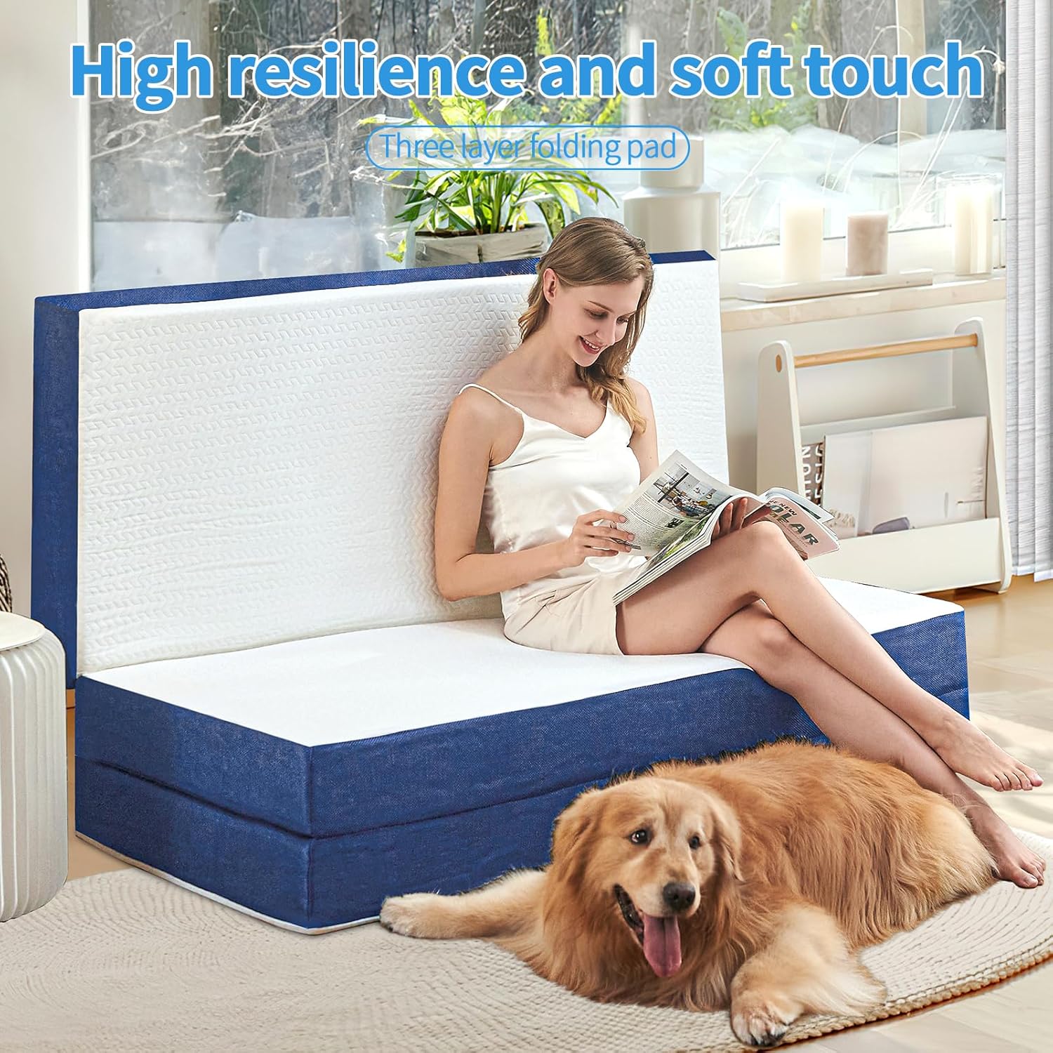 Portable Mattress: CYMULA memory foam trifold mattress features a unique three-fold design that can be easily folded into a small size and stuffed into a travel bag for space-saving, and the convertible foldable mattress not only can be changed freely among lounge chair and floor bed to satisfy your different needs,but also convenient for you to move these folding beds anywhere with the handle design