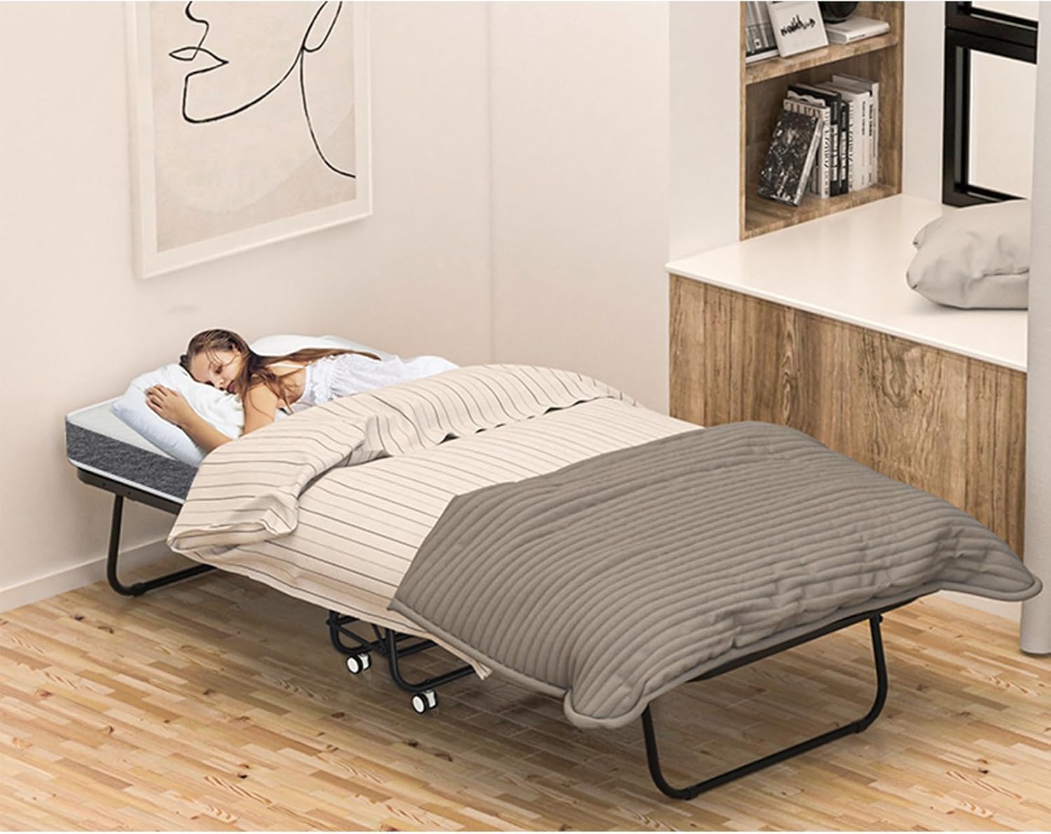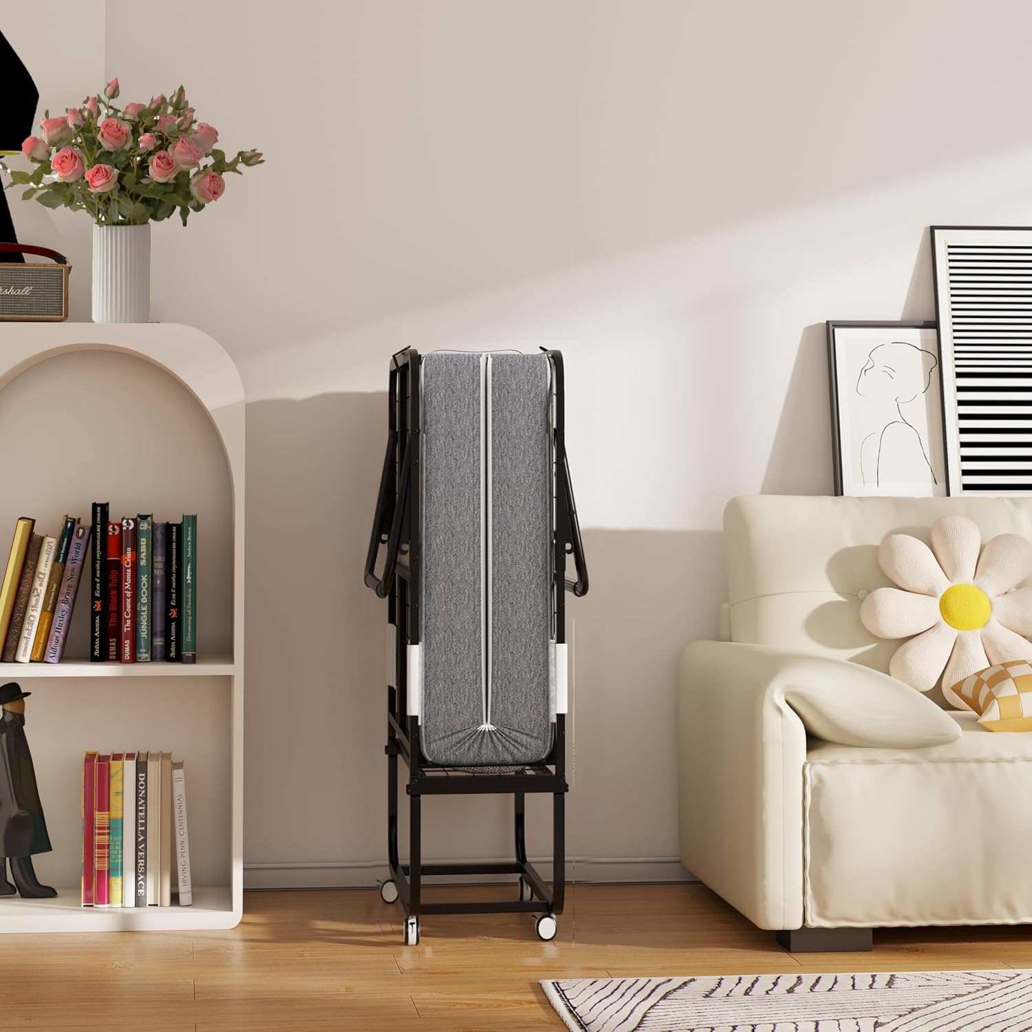 【Space Saving】The folding bed with mattress is fitted with 4 smooth-rolling wheels to ensure easy portability, also lockable when you want to place it. The smooth wheels have minimal noise while using and will not leave scratches on the floor. This day bed is applicable for living room, bed room or guest room. Suitable for small apartment, a guest and office nap.