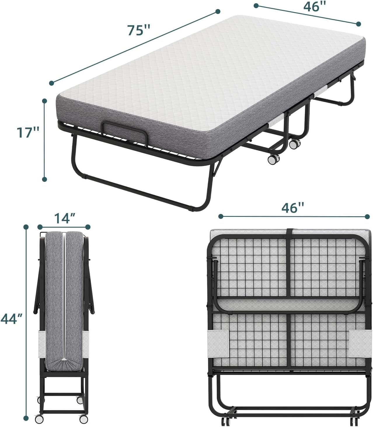 【Foldable Design】The portable day bed can be easily and quickly folded in half, only 14″ thick when folded up, foldable bed is very suitable for limited space and is easy to store. Fold out dimensions – “ 46Length x 14″ Width x 44″ Height. Unfolded Dimensions – 75″ Length x 46″ Width x 17″ Height.