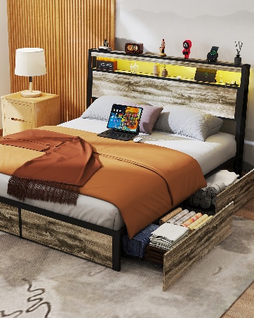 Wood Bed Frame with 2-Tier Headboard & 4 Drawers & Charging Station & LED Light