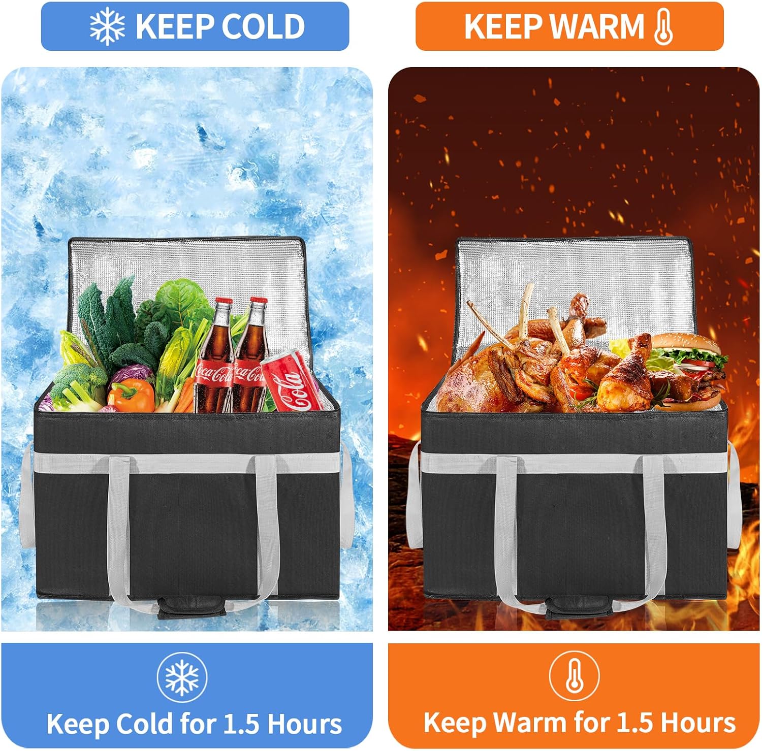 Insulation Excellent: The catering bag features an outstanding insulation layer, composed of superb foil lining, thick thermal foam insulation and high-density fabric, keeping your food warmer or cooler for more than 1.5 hours.