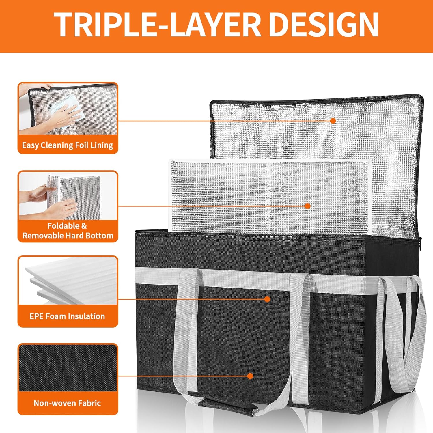 Equiped with Removable Hard Bottom: In order to enhance the insulation effect of this food delivery bag, we have added a thick insulation pad at the bottom, which can be removed and is easy to clean and prevnet food shifting.