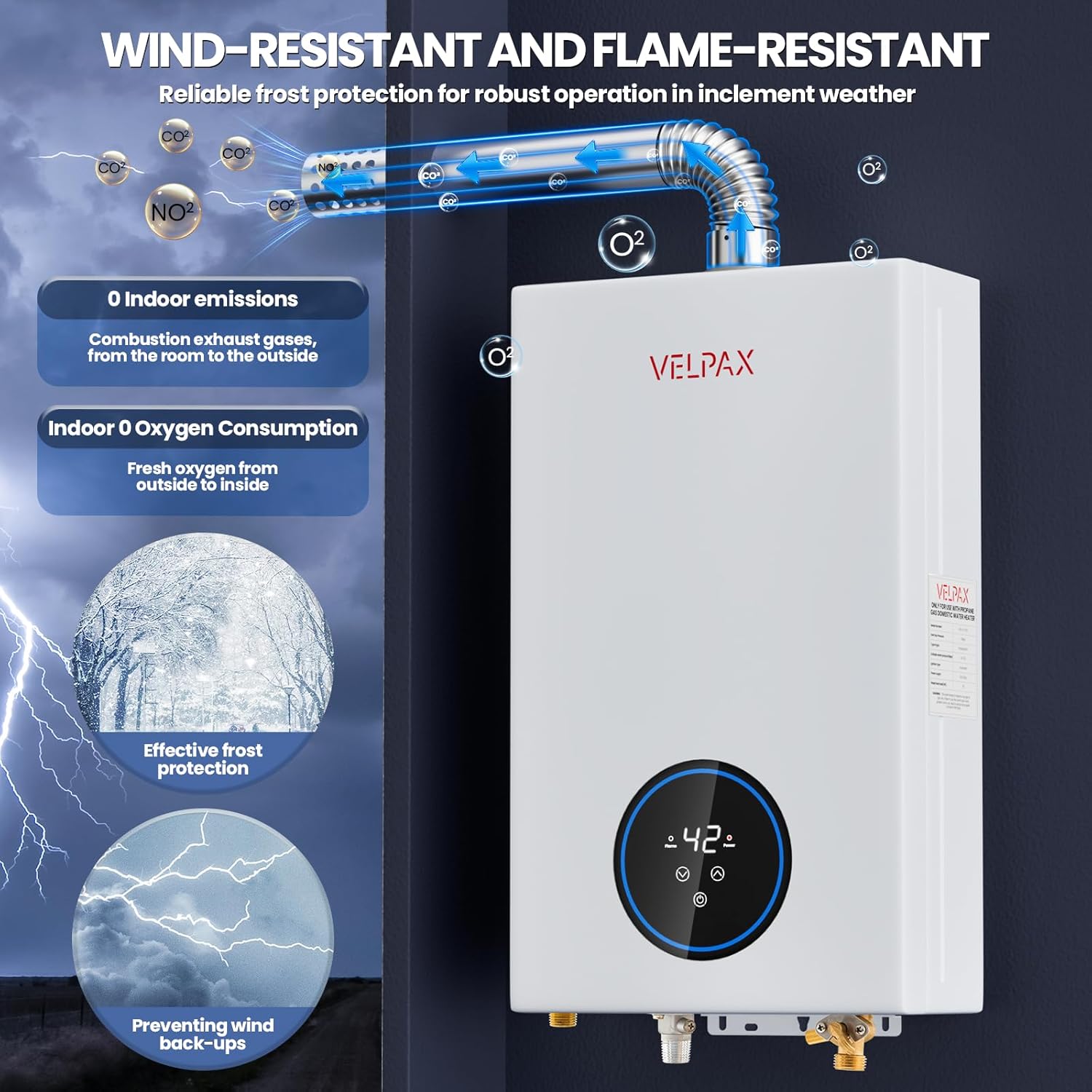 【Efficient & Energy-Saving】– With a high-performance output of 68,000 BTU per hour, this 4.74 GPM instant propane water heater provides on-demand hot water for 2–3 points of use simultaneously, making it ideal for bathrooms and kitchens. The advanced combustion technology minimizes gas consumption and reduces operational noise for a more efficient and quieter experience.