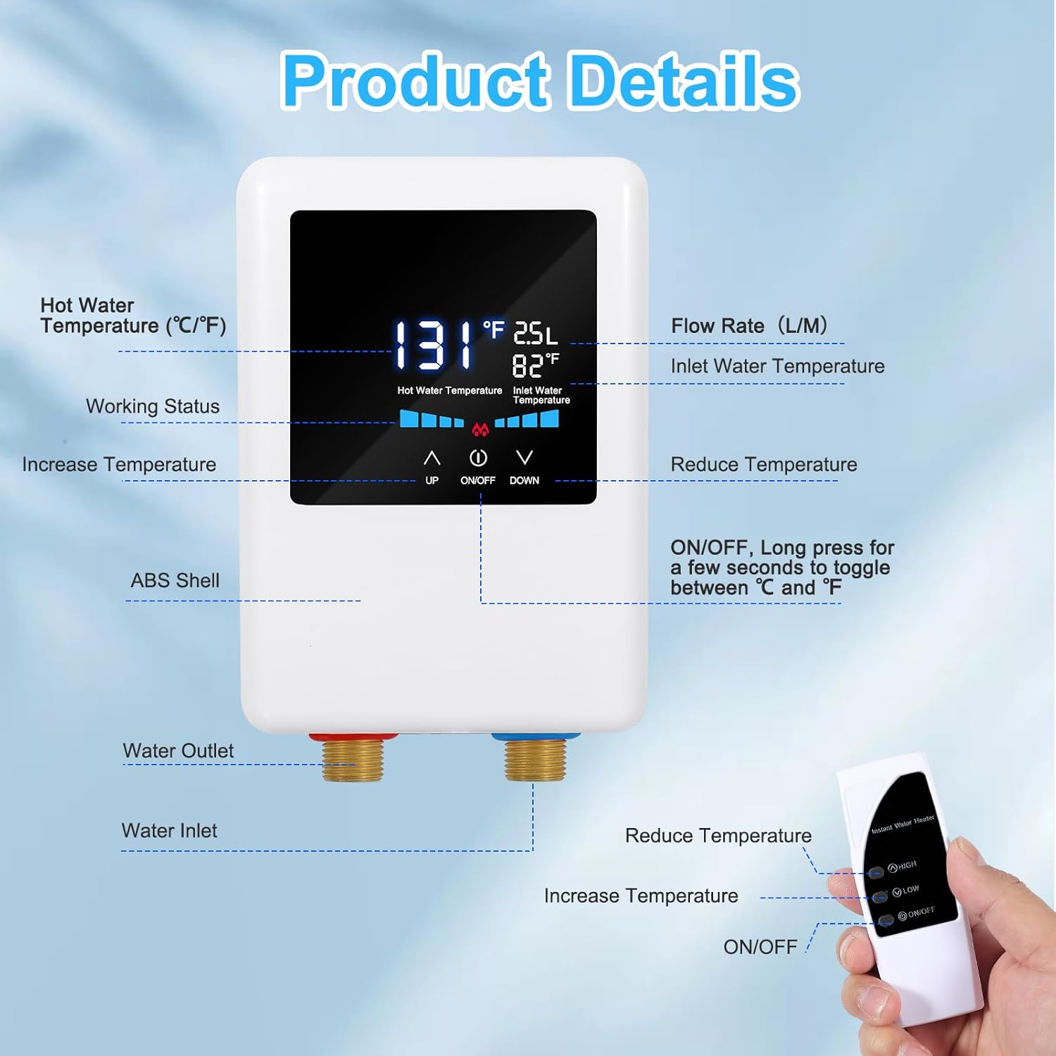【REMOTE CONTROL AND TOUCH SCREEN】The tankless hot water heater electric can adjust the temperature by remote control and touch control, which is more convenient to use, and can avoid wet hand adjustment and safer. The under sink tankless water heater can choose Celsius or Fahrenheit, turn on the instant hot water heater and press the on/off button on the touch screen for a few seconds to change between Celsius and Fahrenheit.