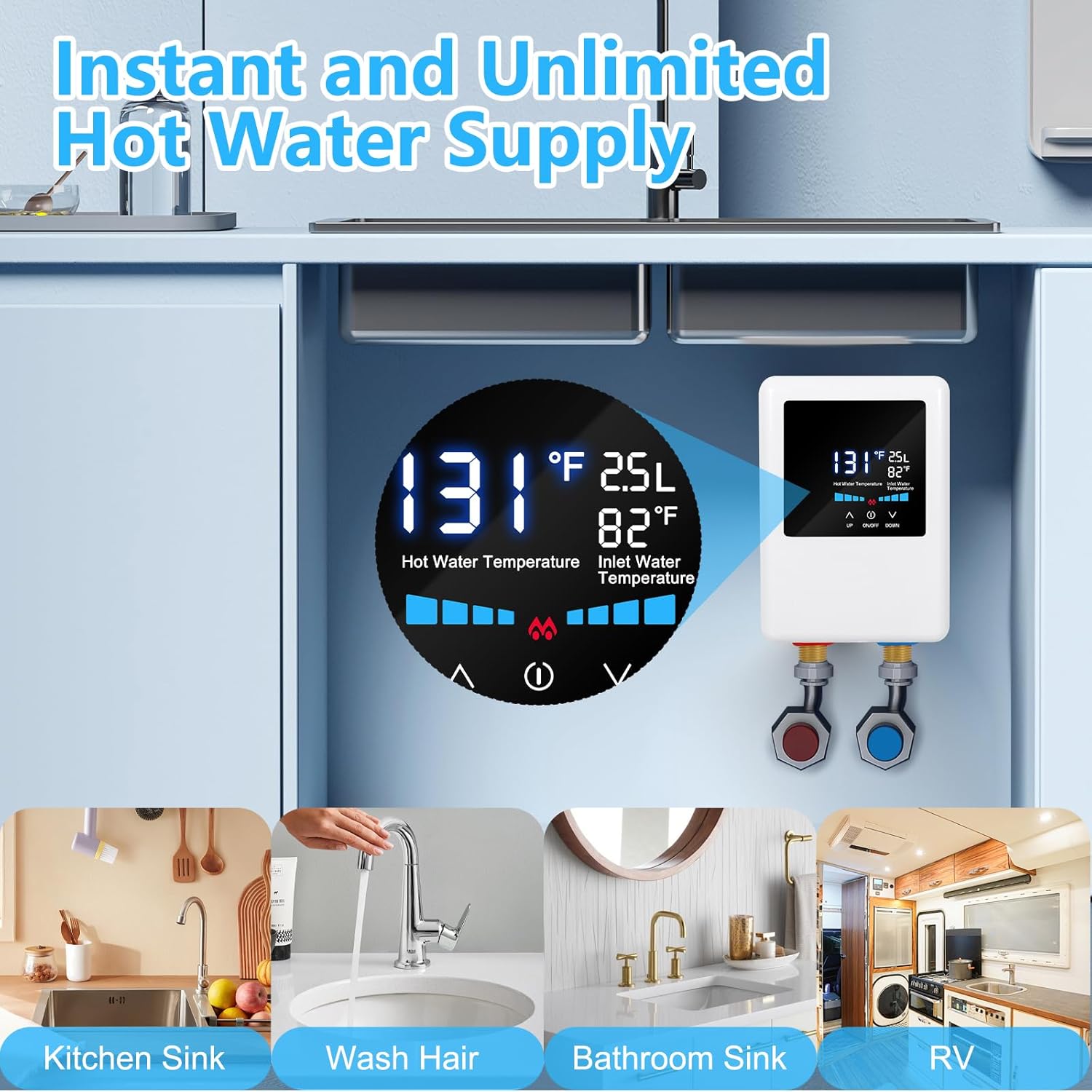 【SAFETY INTELLIGENCE RELIABLE】This under sink water heater electric has multiple protection features. ipx4 waterproof, leakage protection, dry burning protection, super mild and automatic power off in non-working condition. Tankless hot water heater with LCD digital display, intelligent detection of working status and performance to ensure safety.