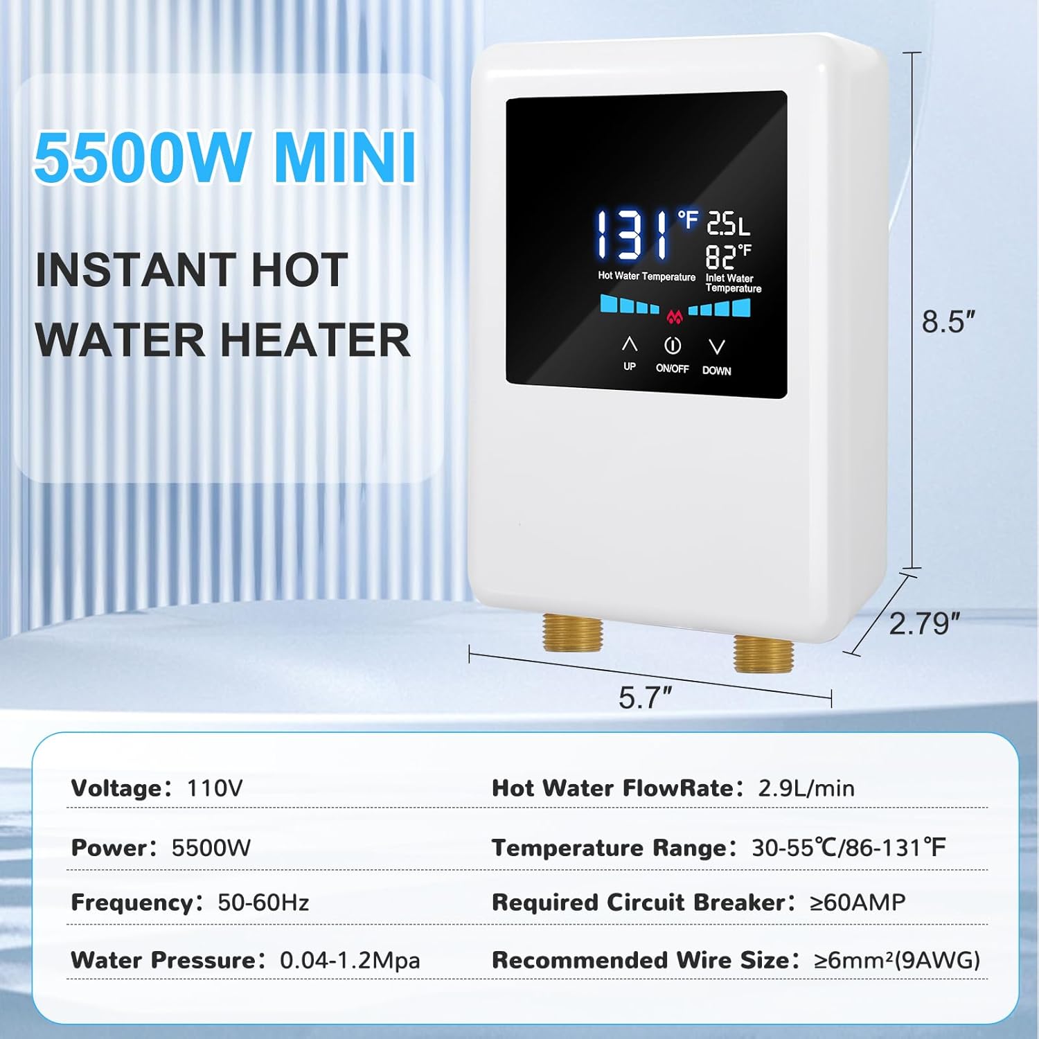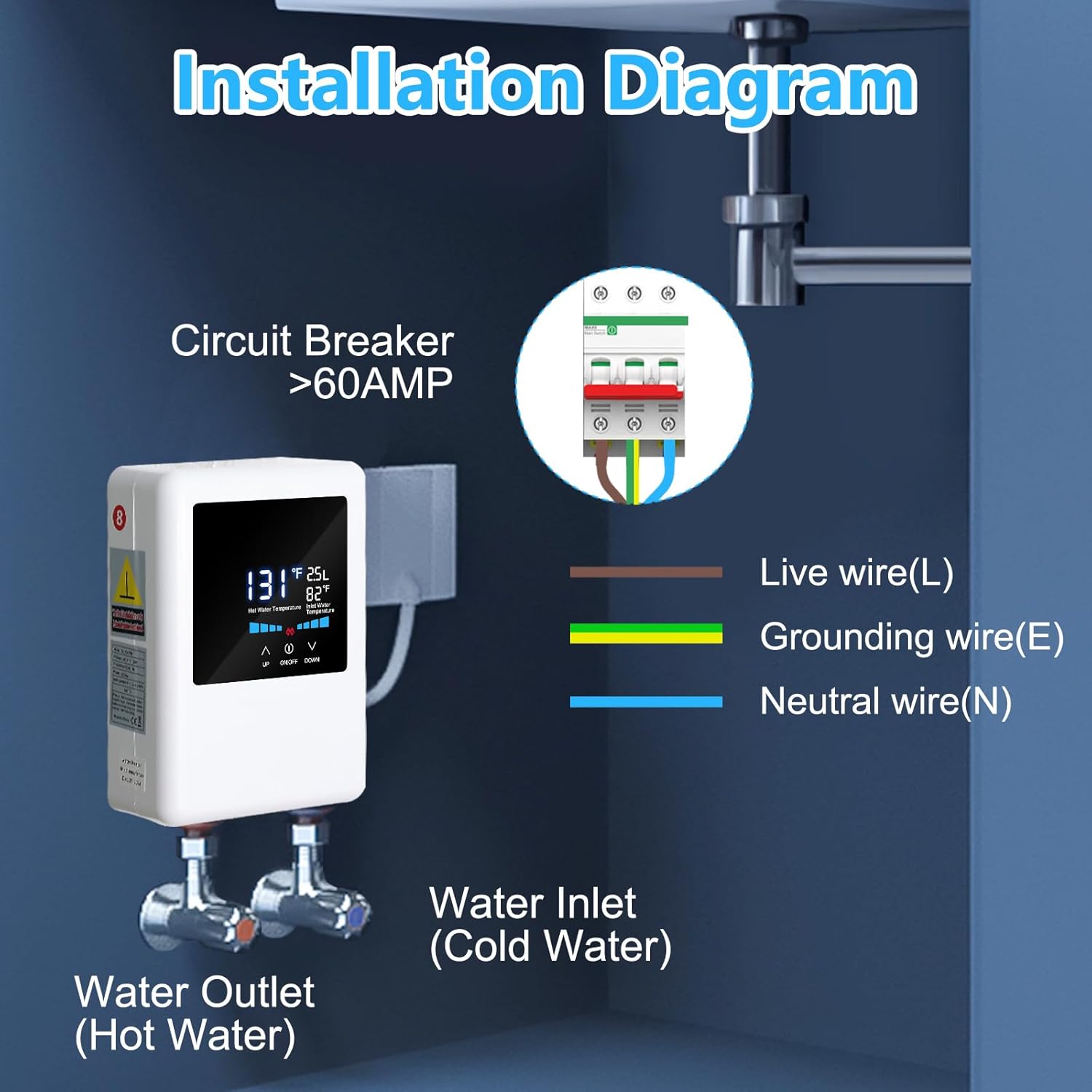 【EASY INSTALLATION & IMPORTANT NOTES】This on demand hot water heater electric has a simple design and is quick and easy to install, saving time and labor. Our instant water heater under sink comes with pre-fabricated set screw holes, English instructions and 1/2 inch NPT standard connections. TIP: Electric water heater wiring requires 6mm ² (9AWG) with a circuit breaker ≥ 60AMP.