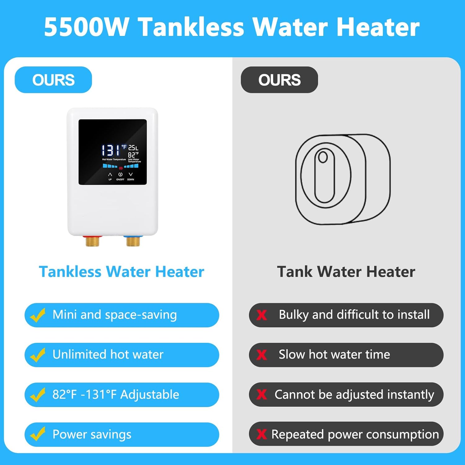 Experience the convenience and efficiency of a 5500W portable water heater. This mini water heater is the perfect solution for U.S. customers seeking instant hot water, space-saving design, energy efficiency and convenience.