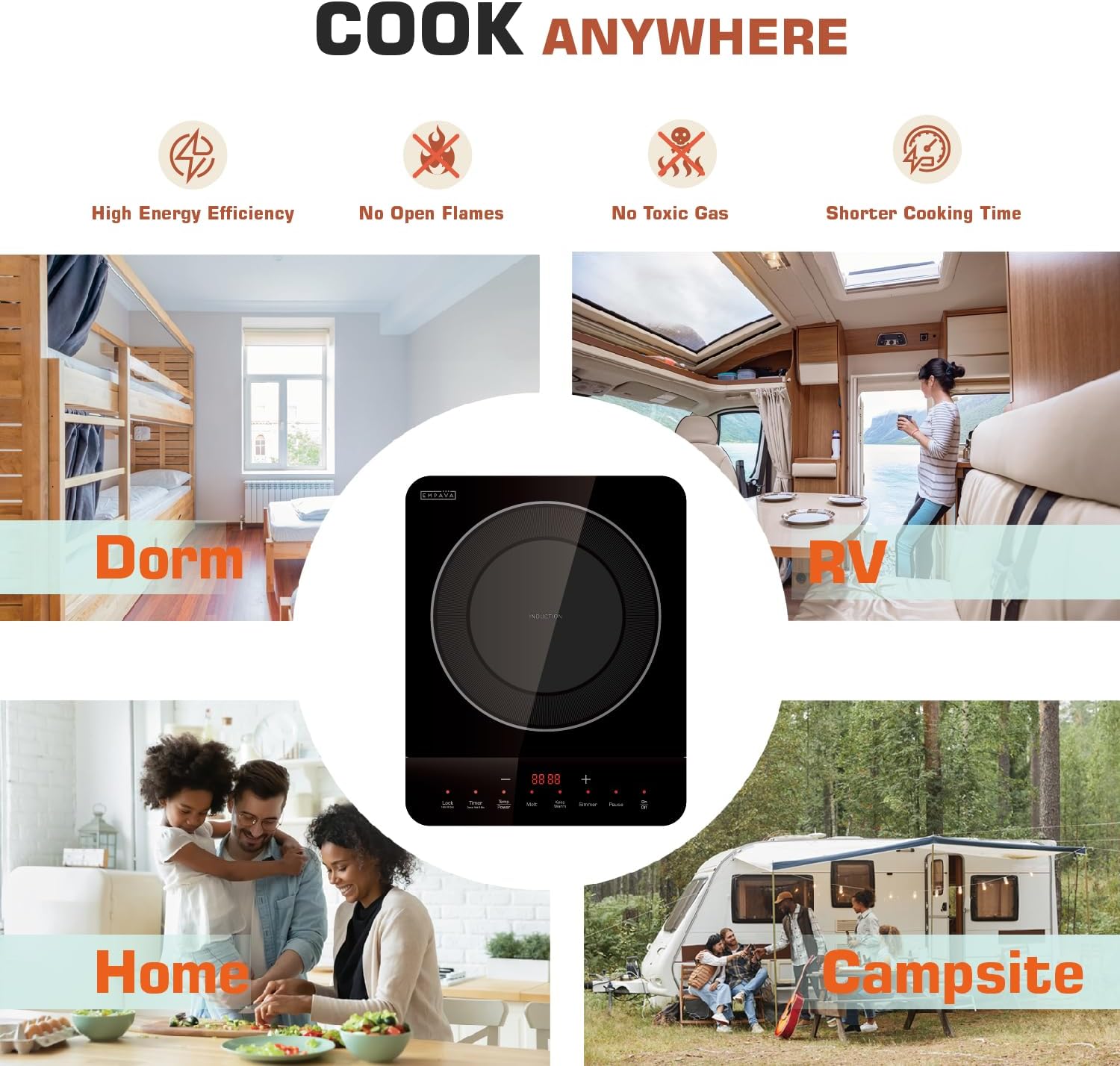 【Advanced Safety Features】: Your safety is our priority. This induction burner is designed to automatically shut off once your set cooking time ends, eliminating worries about unattended cooking. The safety lock ensures it won’t activate without cookware present, and the absence of open flames and hot coils greatly reduces burn risks, making it a safer choice for your family.