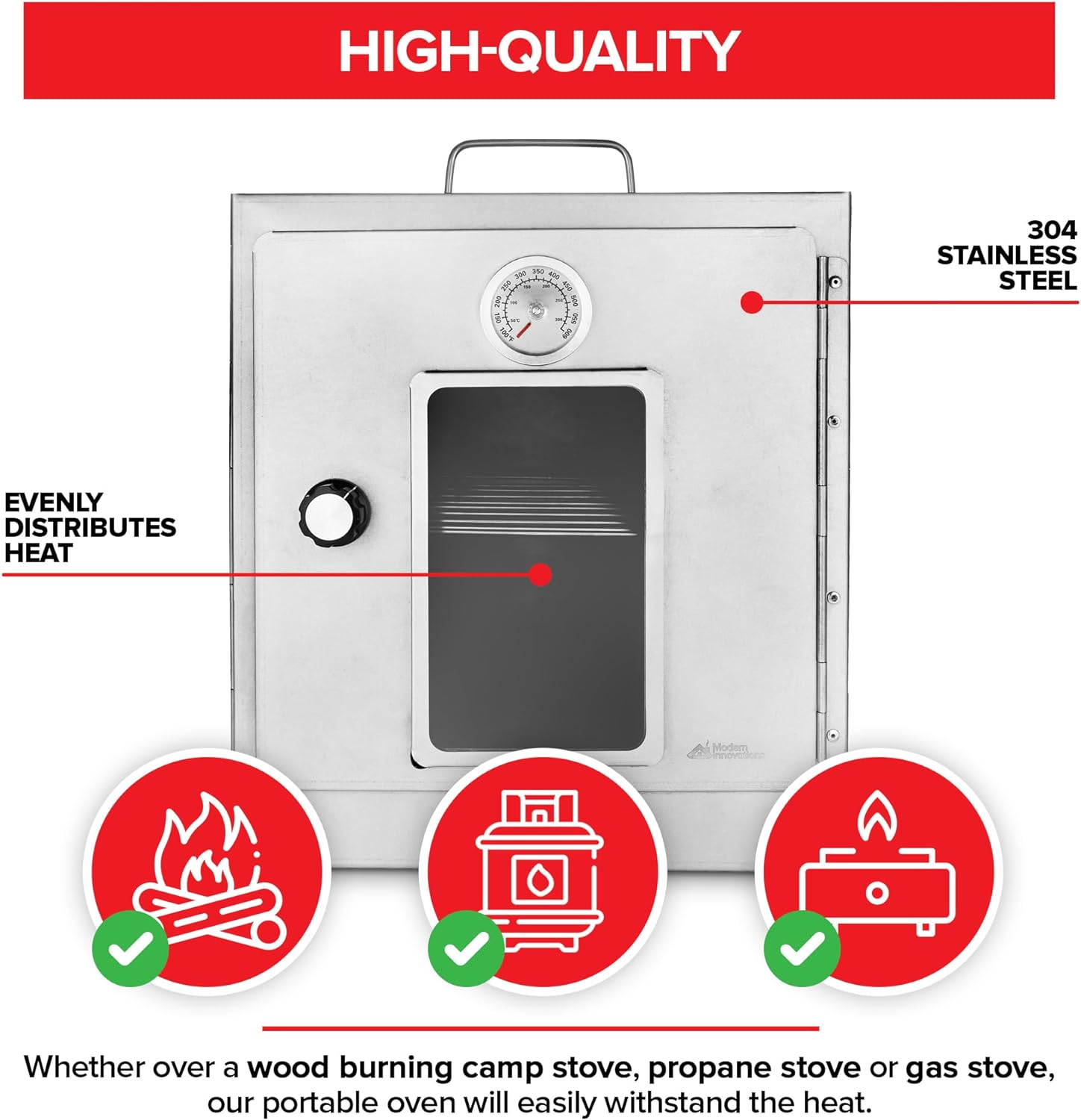 High-Quality: Our camping stove features lightweight yet durable 304 stainless steel panels that retain and evenly distribute heat. Whether over a wood burning camp stove, propane stove, or gas stove, our portable oven will easily withstand the heat.
