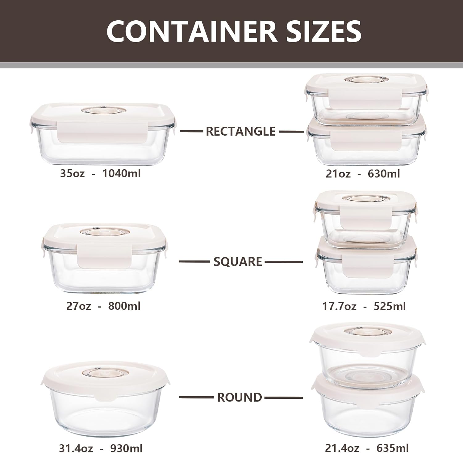 Versatile Set: Includes 9 containers and lids in 6 different container sizes (rectangular, round, and square) to cover all your food storage needs, perfect for meal prepping and leftovers. Sizes include 35oz, 31.4oz, 27oz, 21oz, and 17.7oz for maximum versatility.