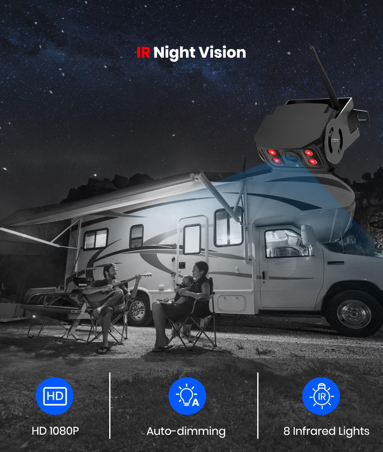 1080P IR Night Vision : The 7″ 1080P rv backup camera wireless system takes clear pictures via TFT-LCD technology, which provides vivid and smooth images without overly saturated colors such as pink or purple. Equipped with 8 infrared lights, when the ambient light is dim, the infrared lights will automatically turn on to see all obstacles behind your car, improving parking safety