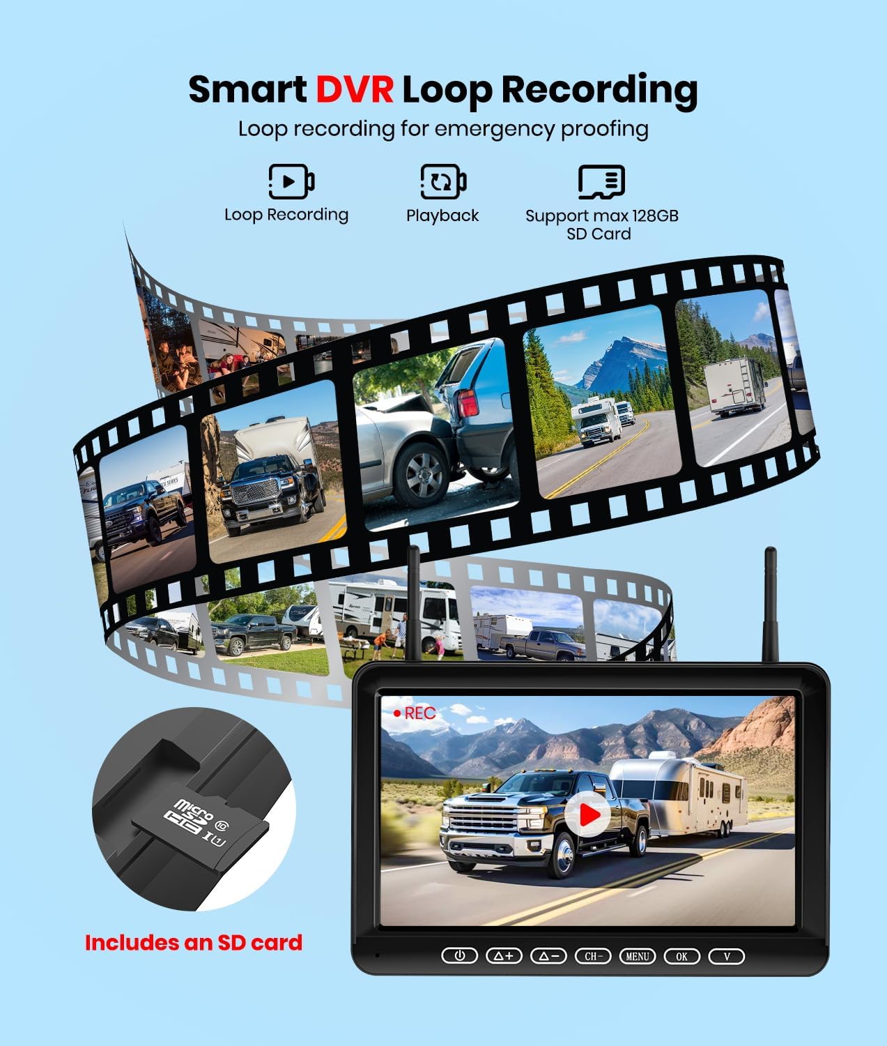 Smart DVR Loop Recording: Drive smarter with crystal-clear vids at optimal FPS, saved on a 128GB SD. Once full, Backup camera for rv system for trailer overwrites old clips, keeping content fresh. In collisions, it secures footage separately, ensuring vital evidence is handy