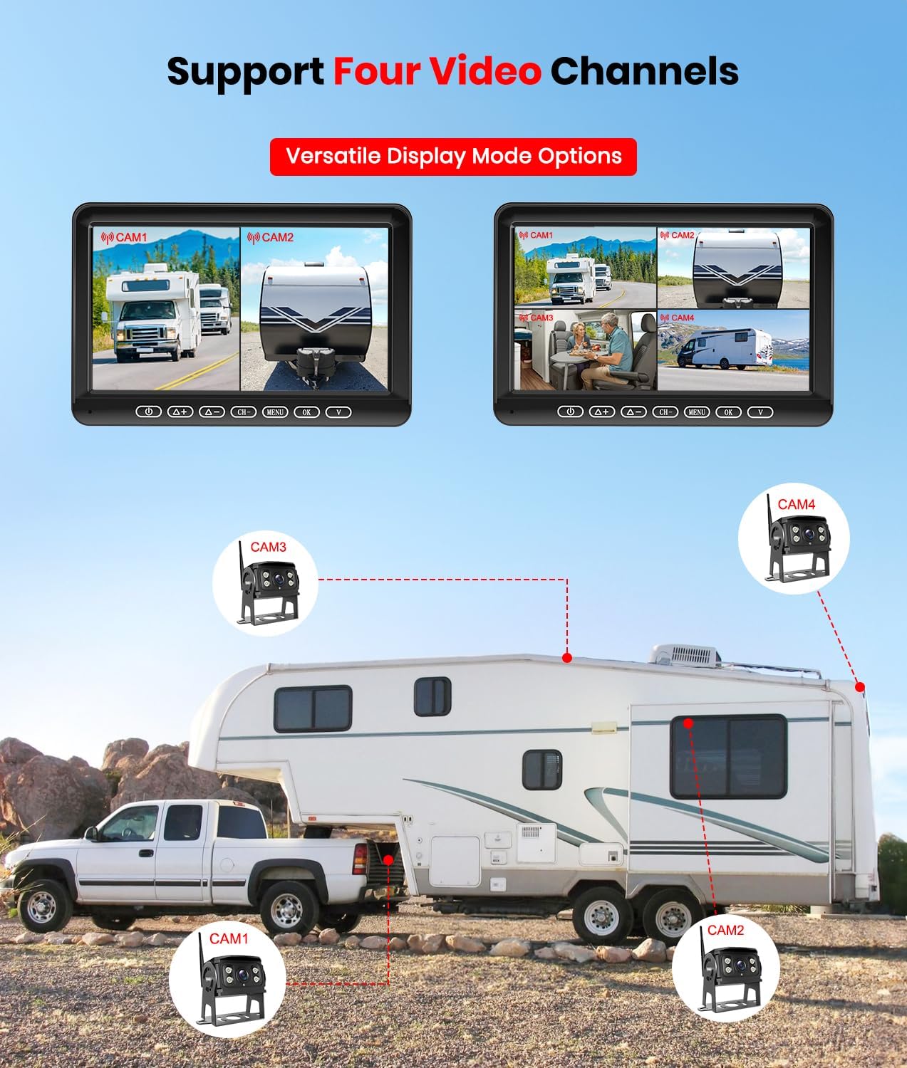 Supports 4 cameras in Split Screen : The wireless backup camera system can add a maximum of four cameras. The monitor image can be rotated for better display when the camera is placed at the front or side of the vehicle, a good helper to eliminate this blind spot, and it can help you with lane change detection and monitor the rear view when the trailer is turning
