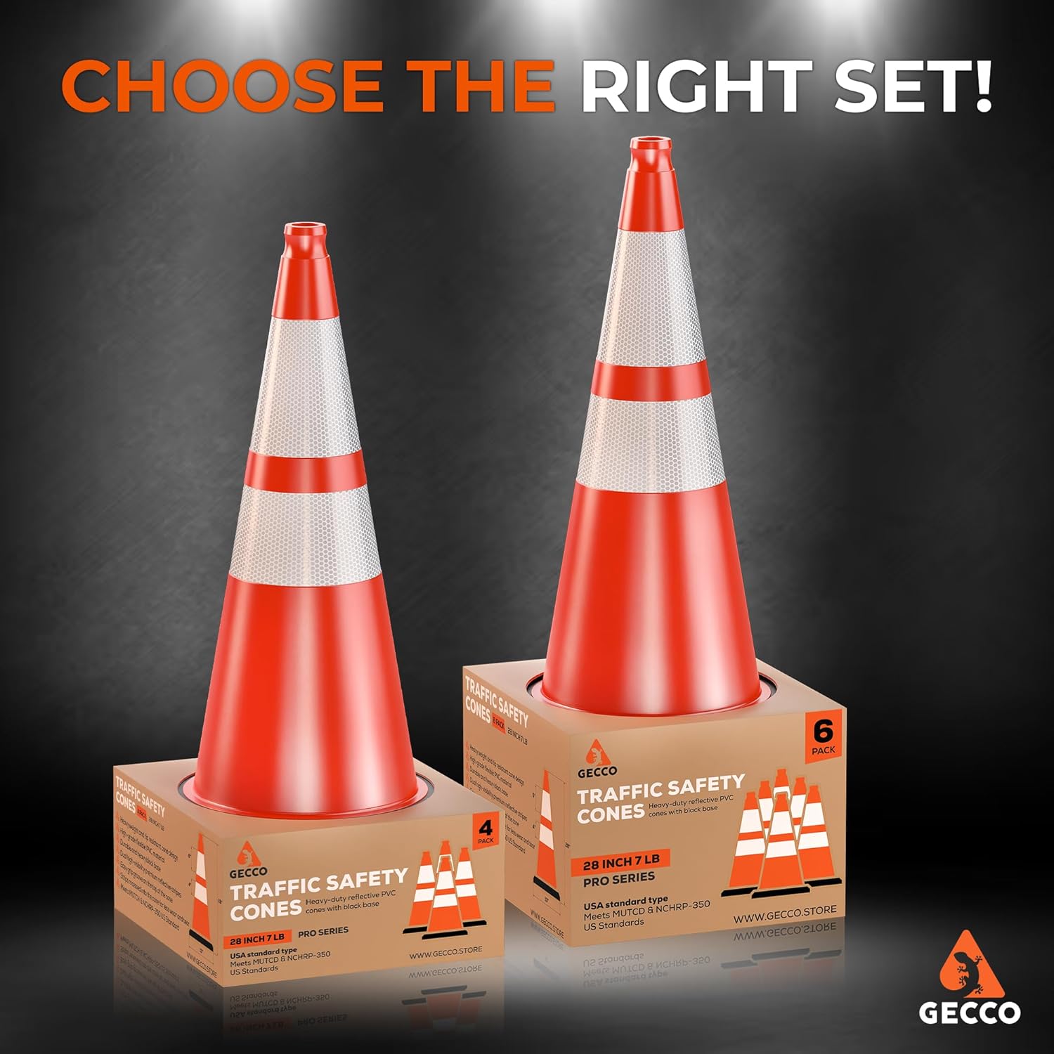 GECCO ™ (6 Pack) 28 Inch 7 Lb Heavy Duty Orange Traffic Cones Set | Durable Safety Cones, Orange Cones, Parking Cones, Construction Cones, Road Cones | PVC Plastic & Black Base – [PRO Series]