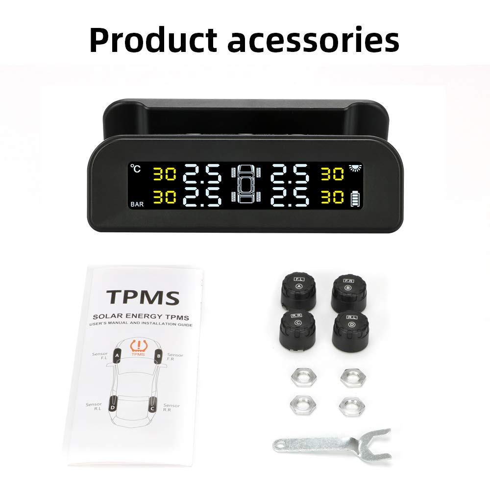 Digital Screen: The car tire monitor have LCD wide-angle digital screen with bright backlight and clear data, whether it is day or night, you can easily read data, pressure and temperature data can be switched (pressure unit is PSI / Bar and temperature unit is C/F.The pressure range is 1.5- 6.0 Bar / 22- 87Psi.