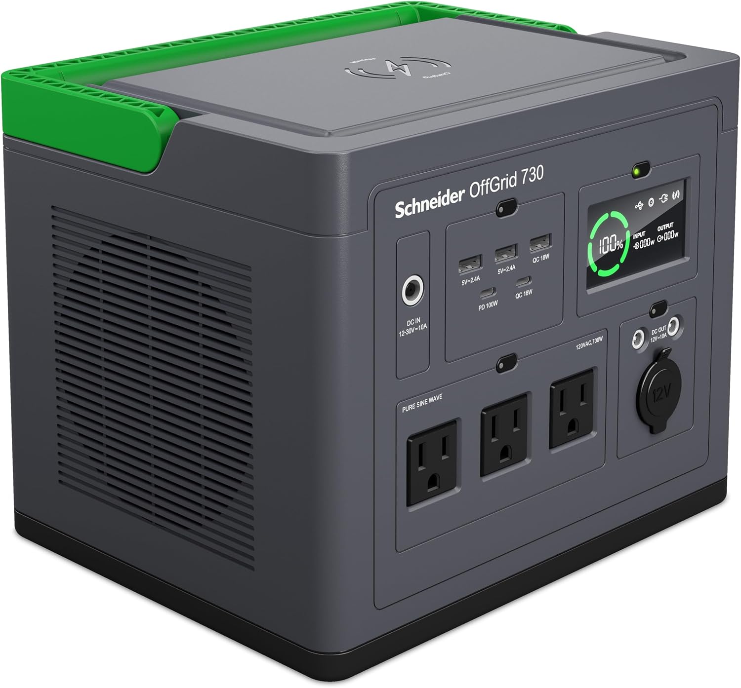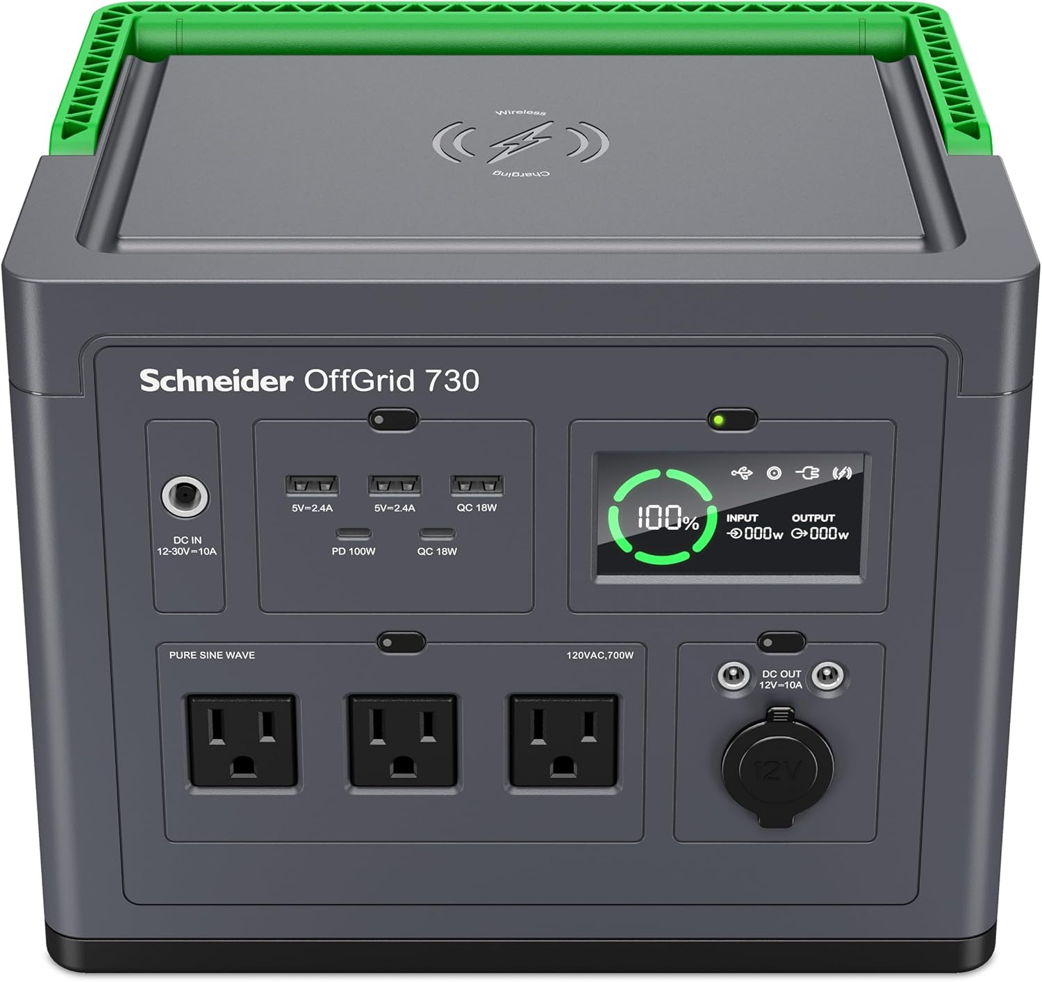 Schneider OffGrid Portable Power Station 700W, PPS730, Lightweight 738Wh Solar Generator: 3 AC Outlets, Quick Charge USB-C PD Port, Wireless Charging, LED Light for Outdoor Camping, RV, Home Backup