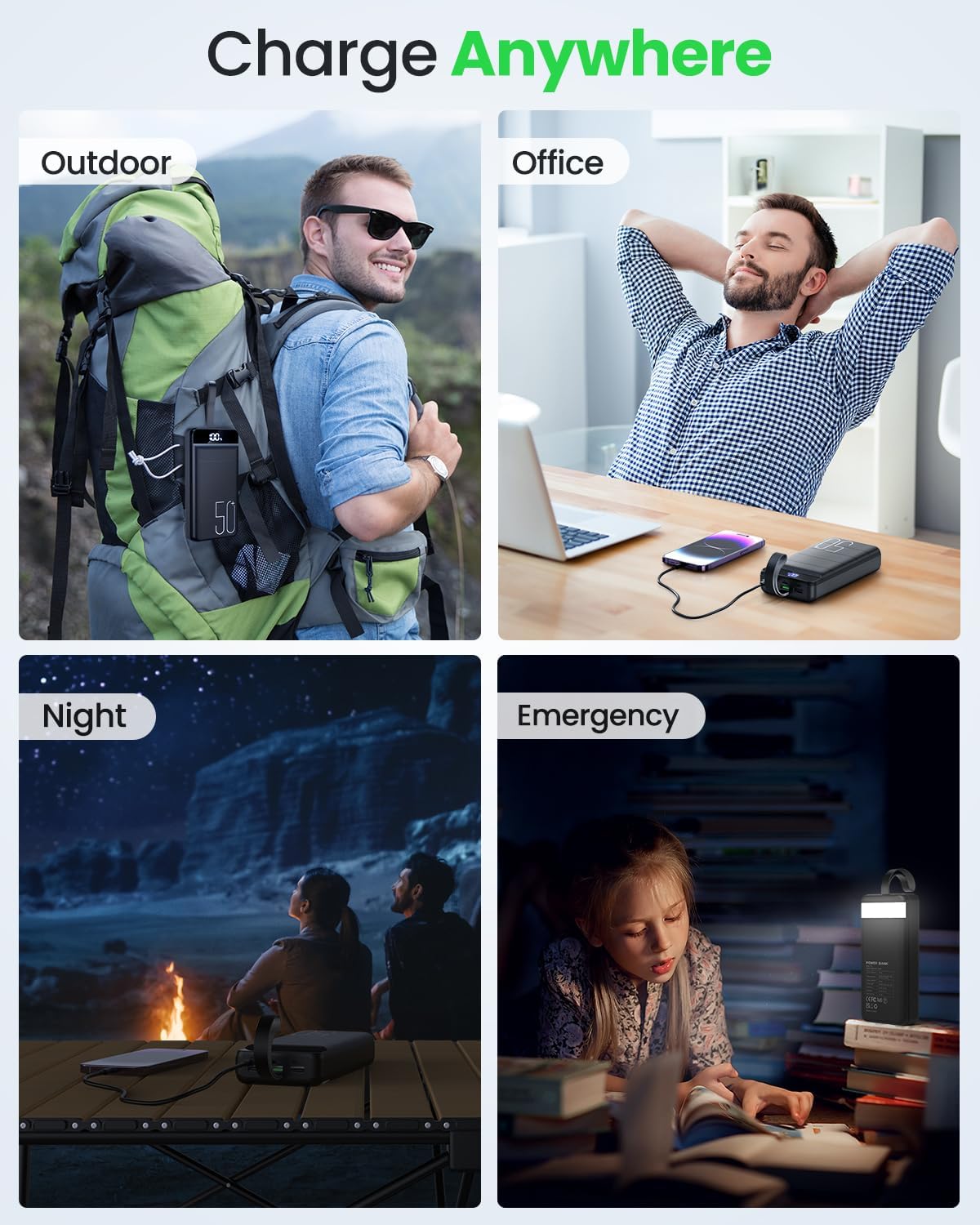 High Capacity 50000mAh Power Bank: The 50000mAh portable charger ultra-high massive capacity charging bank provides 15 charges for iPhone14, 13.5 times for Samsung S20. Depending on battery size, most smartphones will get over 10 full charges. Suitable for camping, hiking, fishing vacation, travel and other outdoors activities