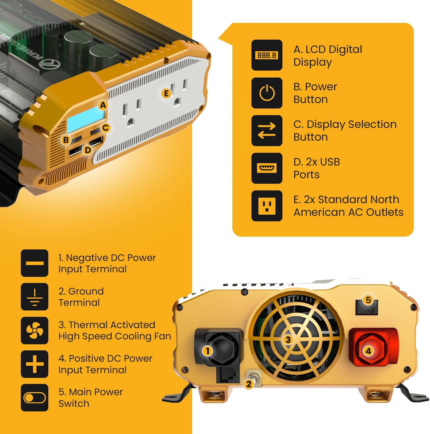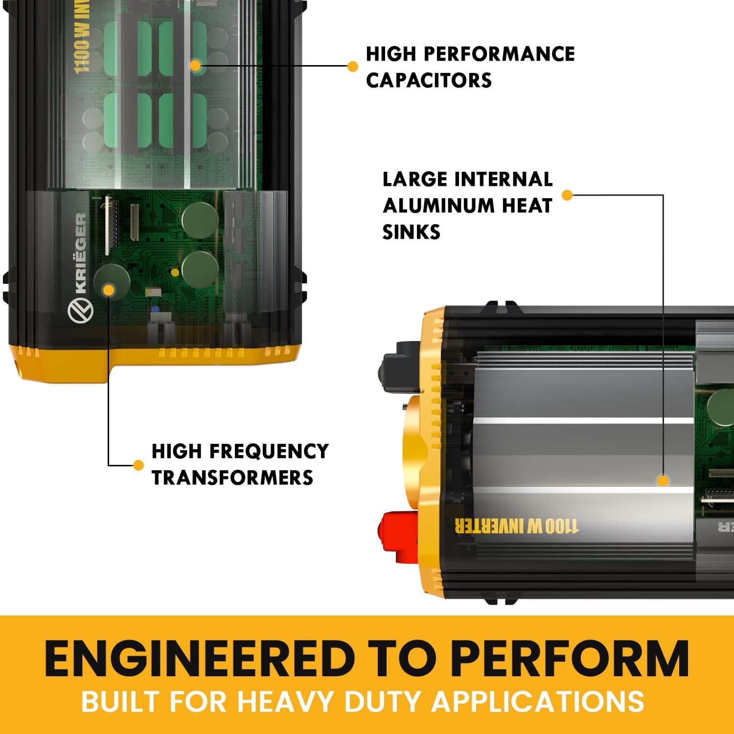 Krieger 1100 Watt 12V Power Inverter Dual 110V AC Outlets, Installation Kit Included, Automotive Back Up Power Supply For Blenders, Vacuums, Power Tools – ETL Approved Under UL STD 458