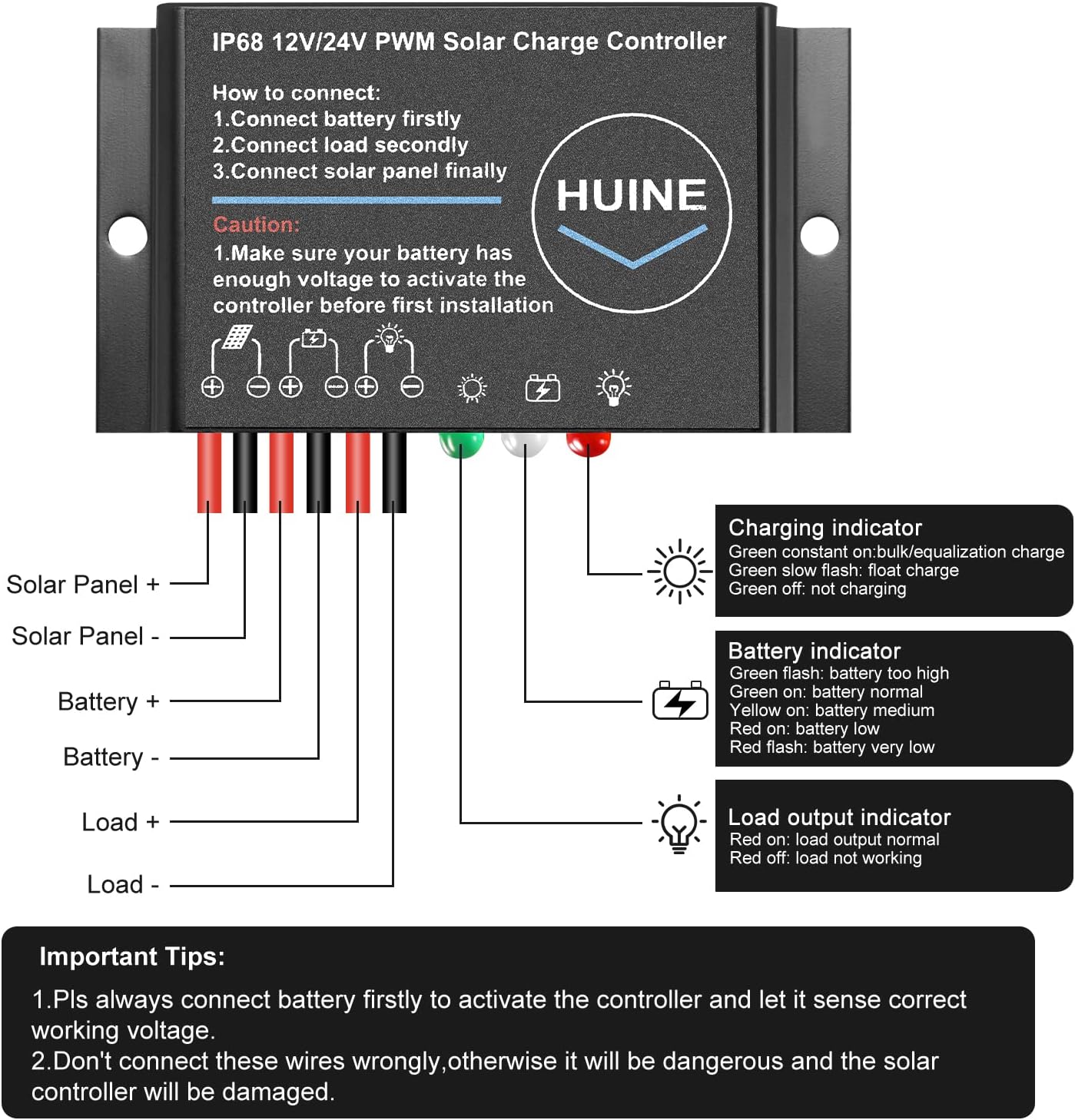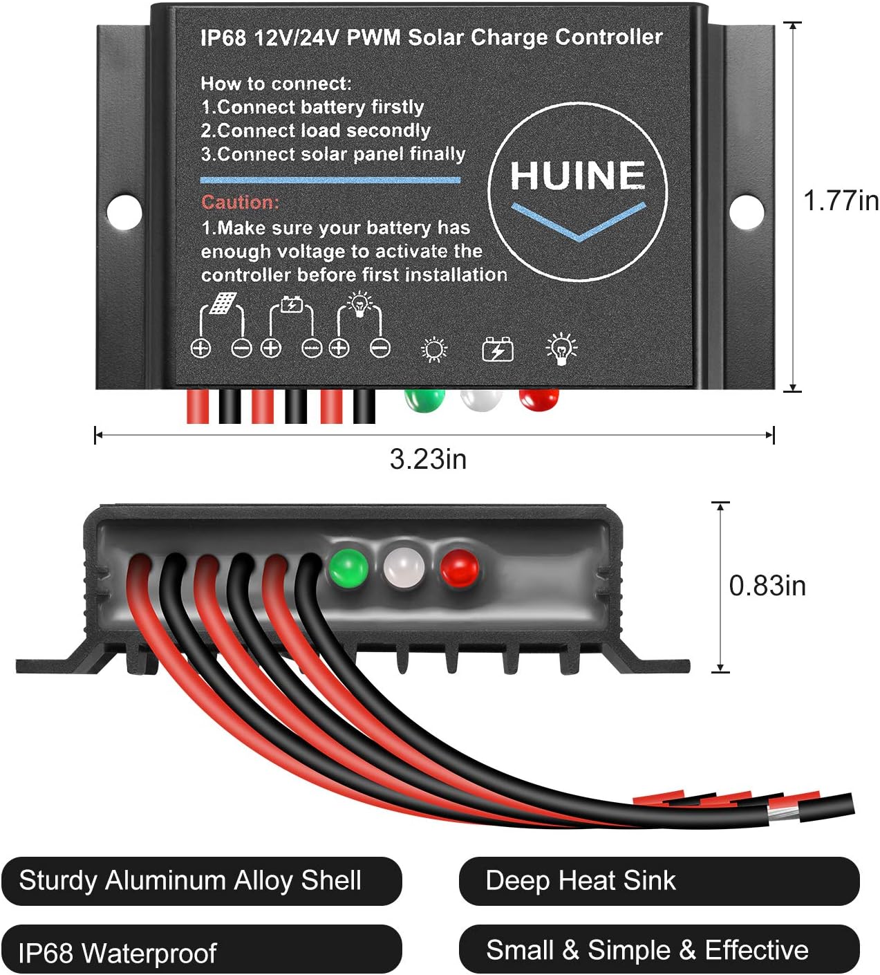 20A 12V 24V Auto IP68 Waterproof PWM Solar Charge Controller Solar Panel Battery Intelligent Regulator for Solar System Caravan Boat(24 Hours Working Mode)