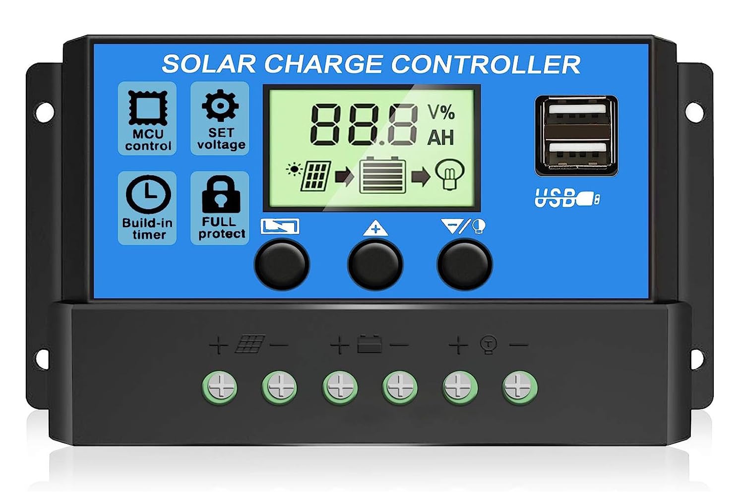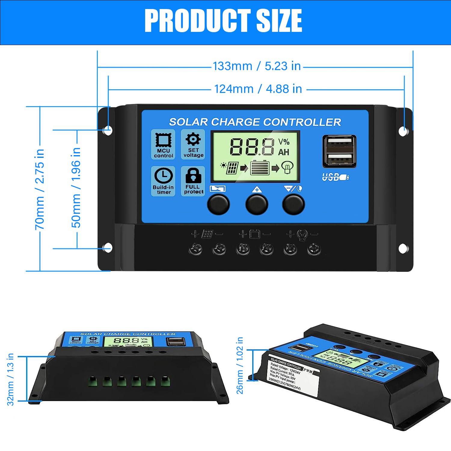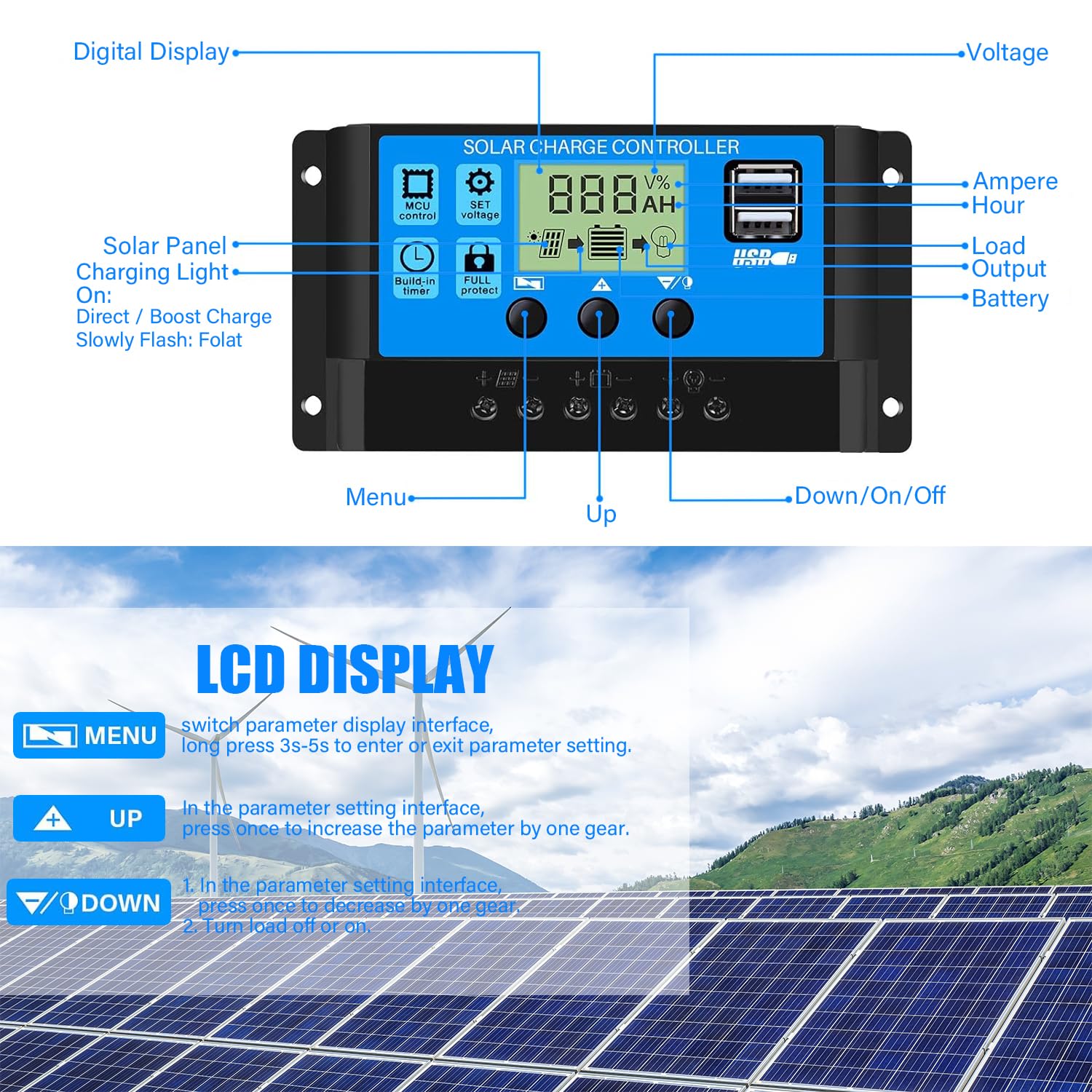 30A PWM Solar Charge Controller, 12V 24V Dual USB Solar Panel Battery Intelligent Regulator with LCD Display, Auto Parameter Adjustable, Timer Setting, Multiple Load Control Modes