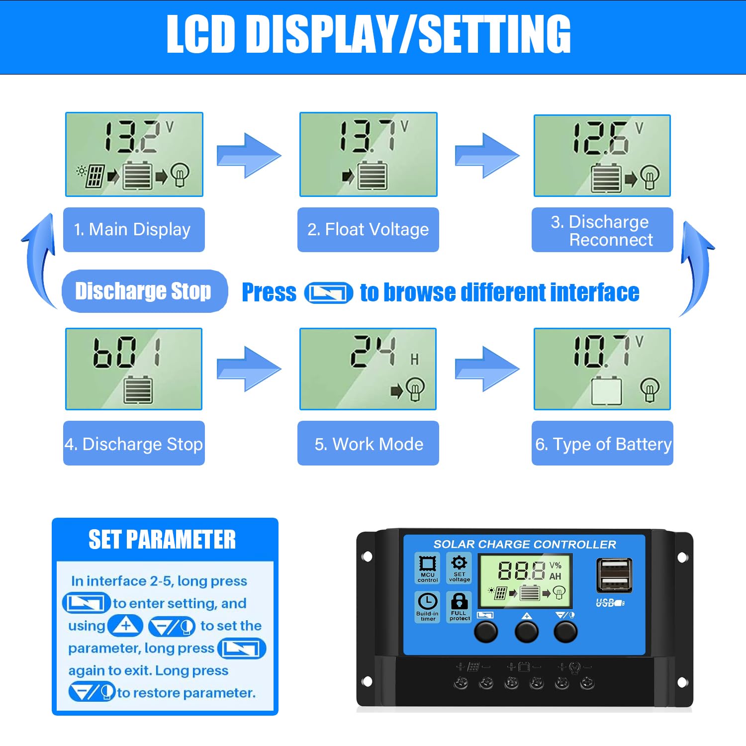 EASY TO READ AND ADJUSTABLE: Easily to read the status and data with an LCD display, which is also able to switch modes and parameter configuration, such as adjustment of battery float, reconnect, and stop discharge voltage, which can perfectly protect the battery from over-discharge, suitable for home, industrial, commercial, etc