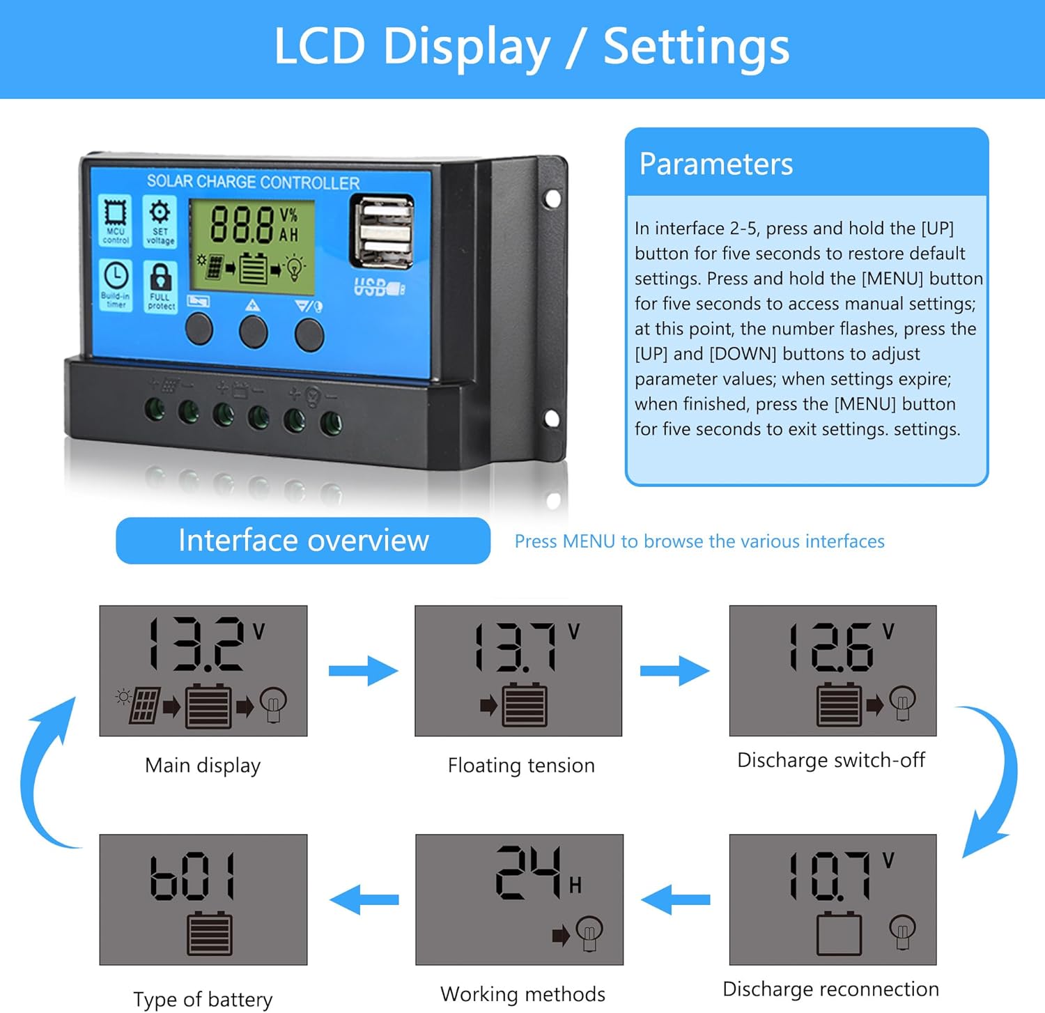 The regular is only suitable for lead-acid batteries: OPEN, AGM, GEL.( It’s not suitable for nickel metal hydride, lithium ions or other batteries)The charge regulator is only suitable for regulating solar modules.( Please do not connect other charging source to the charge regulator)The LCD display has an error of 0.2 V- 0.3 V, but this is normal.