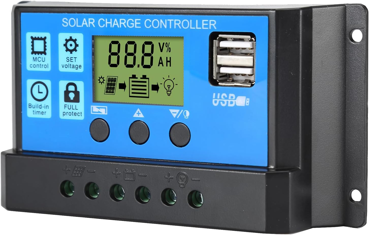 Using 3C standard chips and dedicated software,automatically managing the working of solar panel and battery in solar system. Built-in industrial micro controller.Large LCD display and adjustable parameter.Fully 3-stage PWM charge management.Multiple Protection Function:hort-circuit protection, open-circuit protection, reverse protection, over-load protection, low voltage and overcharge protection.Really easy to install and operate.