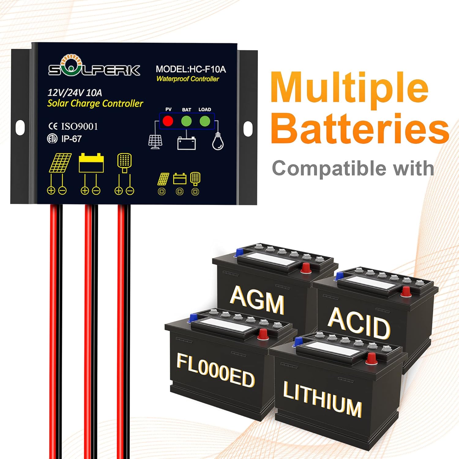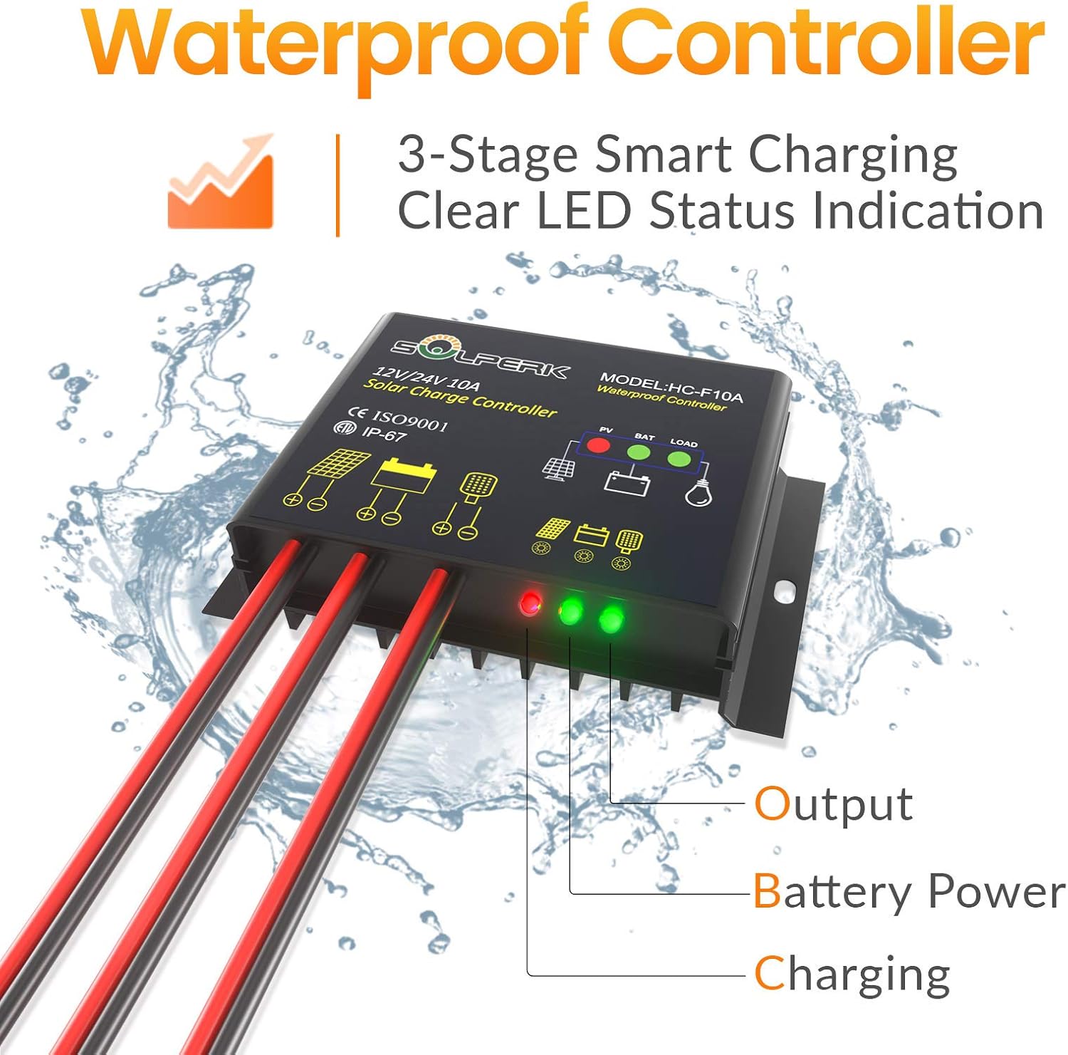 ✔️【Waterproof Solar Charge Controller】IP67 waterproof, suitable for outdoor use. Automatically identify voltage, 12V Max power: 150W, 24V Max power: 300W. The maximum current is 10A. Compatible with various 12V/24V deep-cycle batteries, such as AGM, GEL, Flooded. Adopting brand MCU chips to realize fast intelligent control and ultra-low standby power consumption.