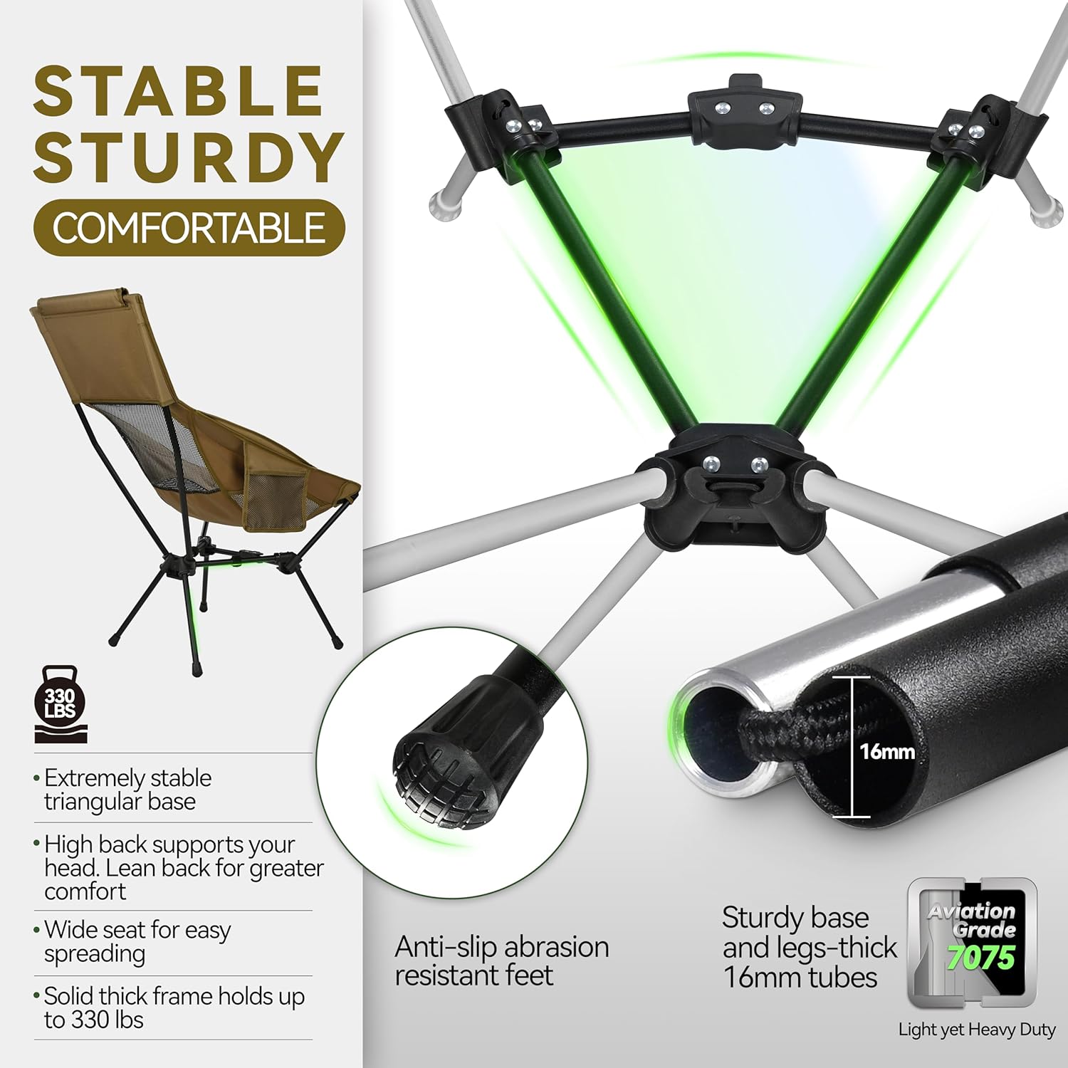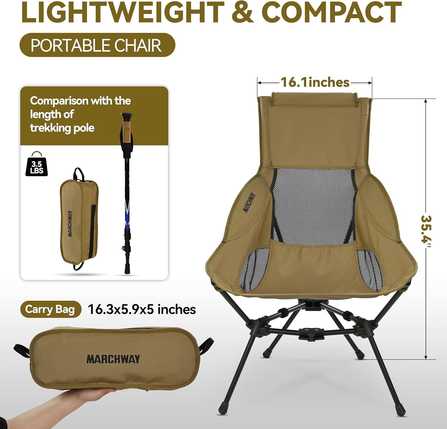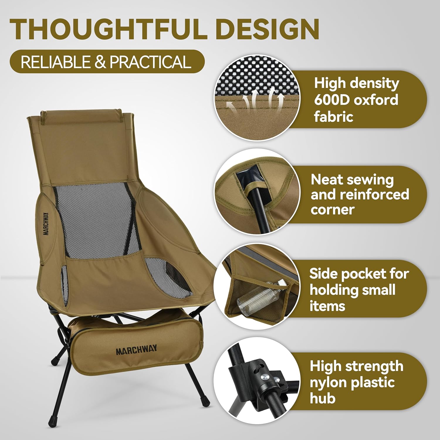 MARCHWAY Lightweight Folding High Back Camping Chair with Head Support, Stable Portable Compact for Outdoor Camp, Travel, Beach, Picnic, Festival, Hiking, Backpacking (Highback Khaki)