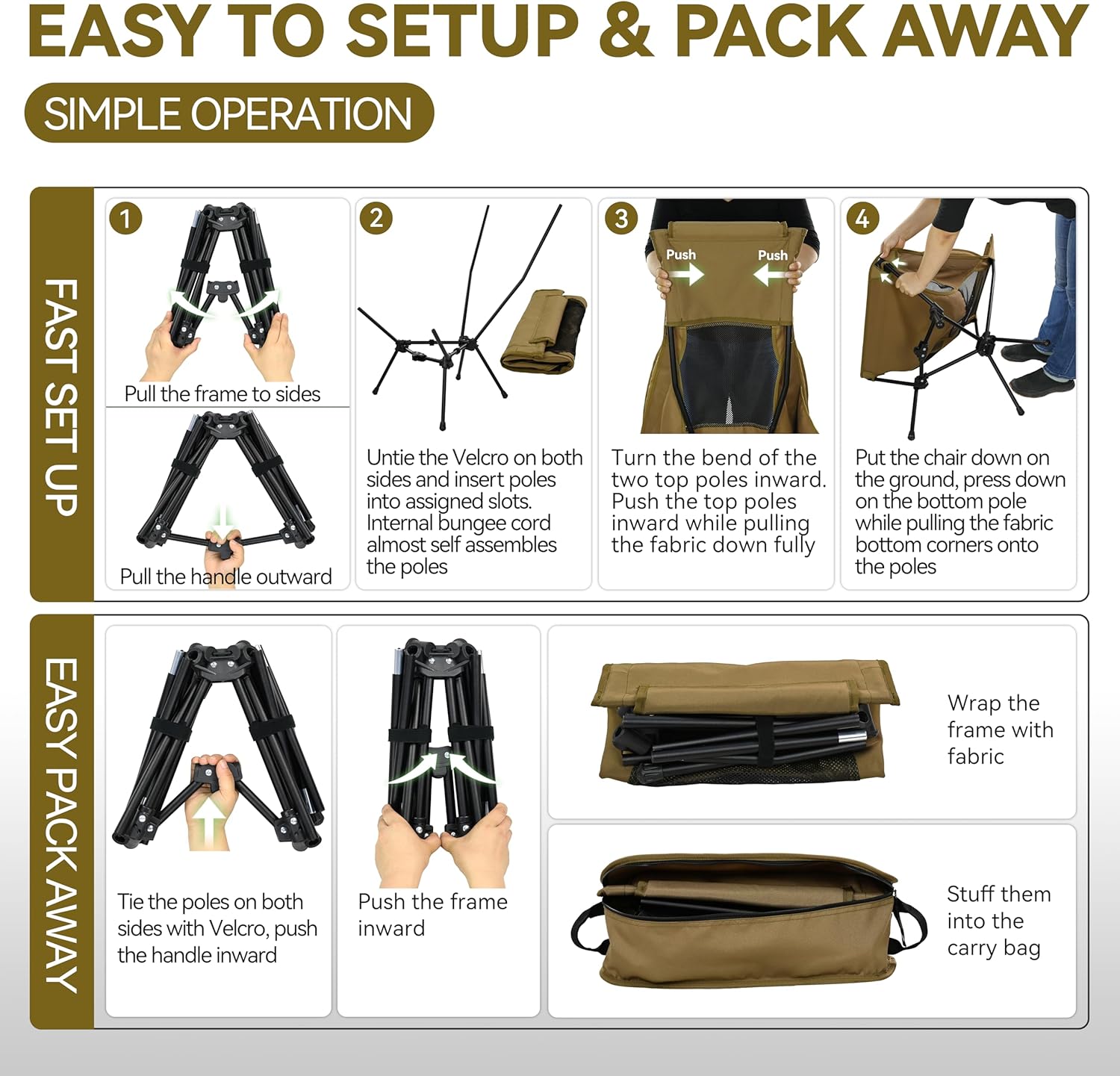 Easy Setup and Packup: Frame almost sets itself up with elastic cords going through the poles. Fabric seat sleeves just slip over each of 4 poles. 2 velcro straps make it easy to fold up the frame, you can tie the poles on one side first and then the other side in order. You can do it in a minute with a little practice.